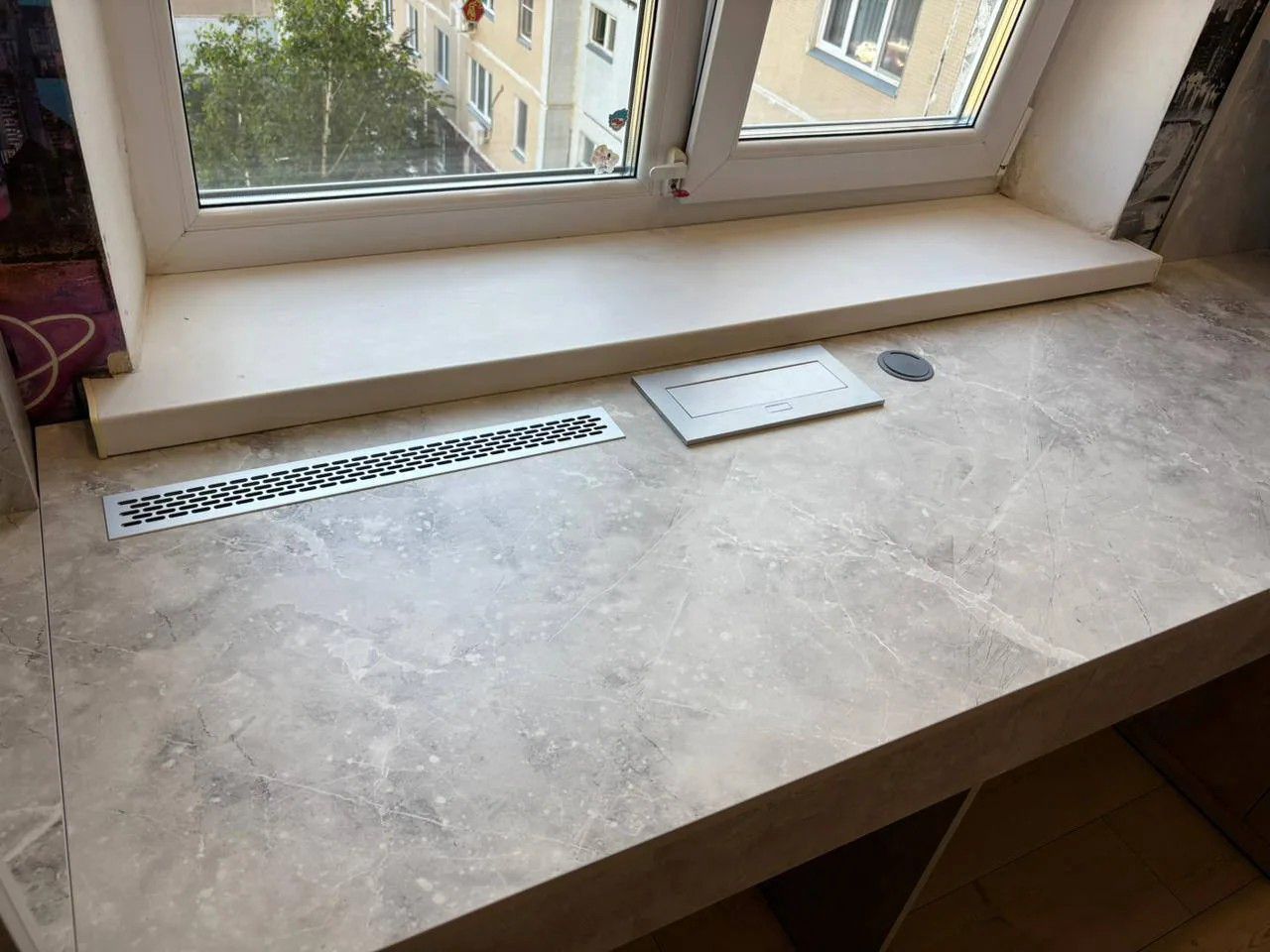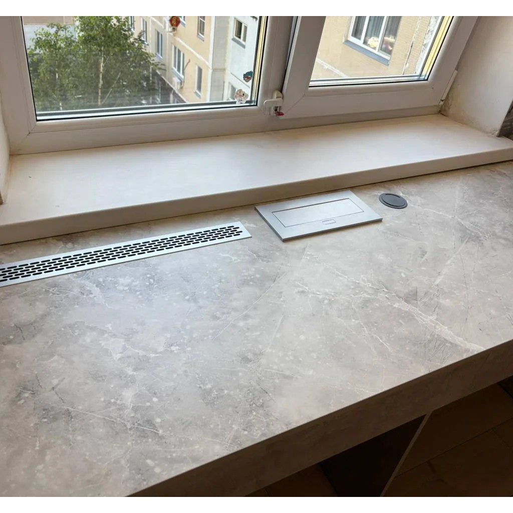 - Электрика: Встраиваемая розетка (вырез по размерам клиента) — безопасное подключение гаджетов и лампы прямо на столе.