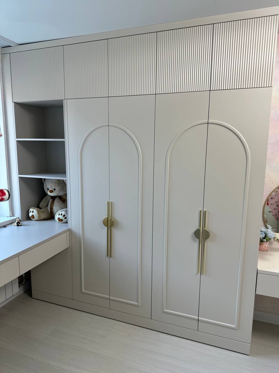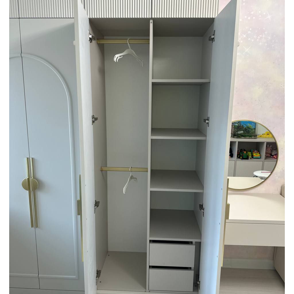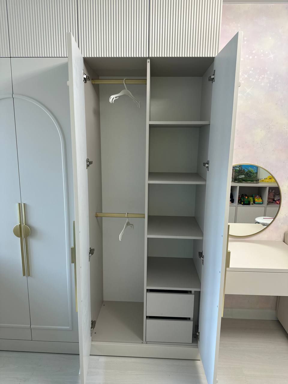 Мы выбрали мягкую, успокаивающую палитру, где нежный серый «Кашемир» встречается с тёплым «Софт Латте». Эти оттенки создают гармоничный фон для развития воображения, не перегружая пространство. Зеркальная поверхность добавляет света и воздуха, превращая комнату в настоящий сказочный уголок.