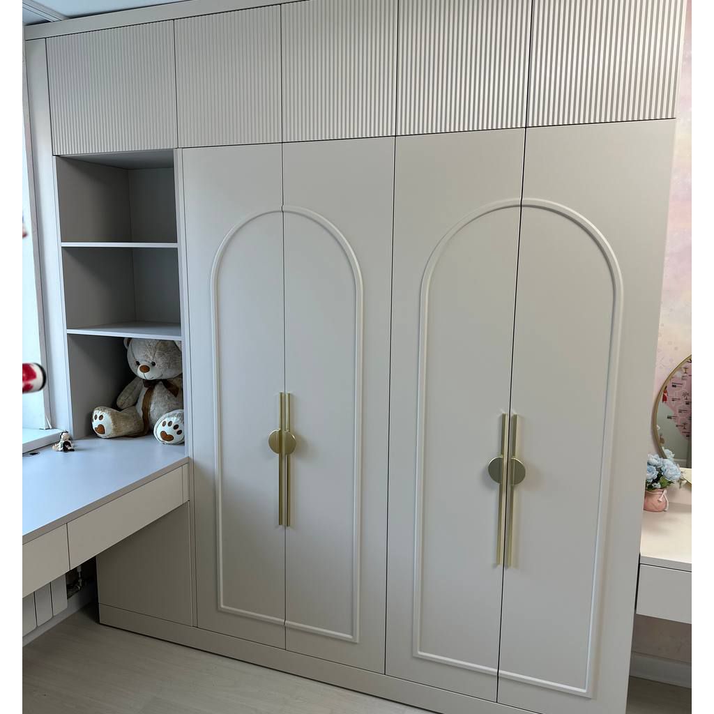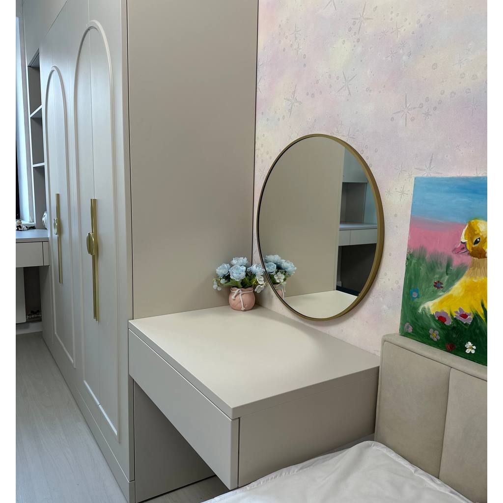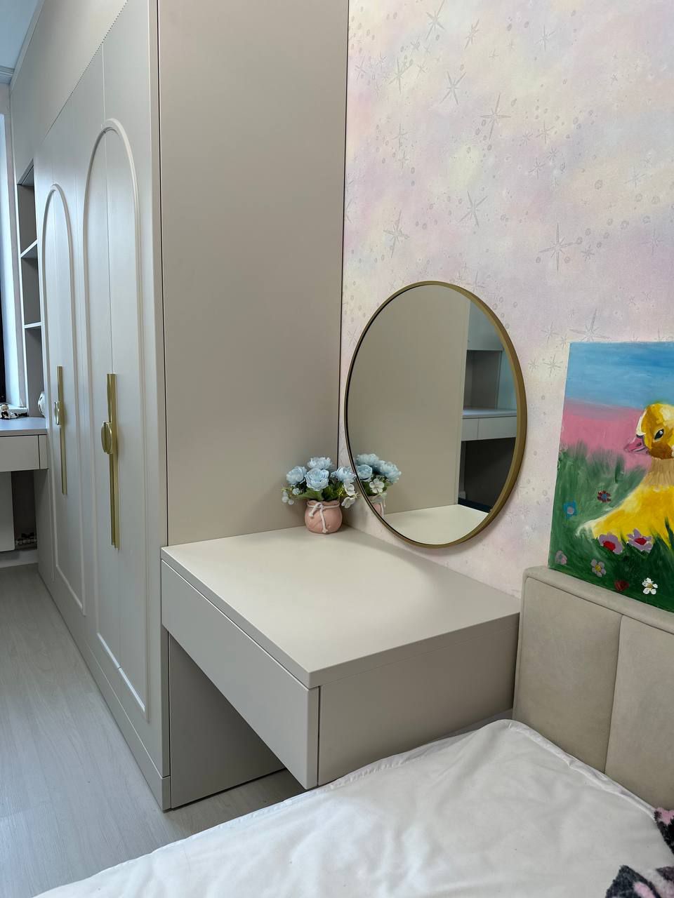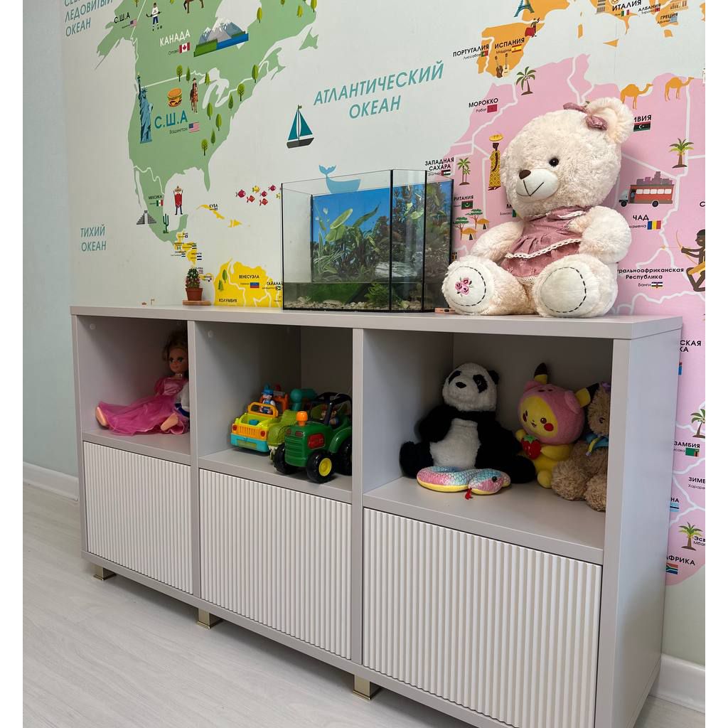 Мы выбрали мягкую, успокаивающую палитру, где нежный серый «Кашемир» встречается с тёплым «Софт Латте». Эти оттенки создают гармоничный фон для развития воображения, не перегружая пространство. Зеркальная поверхность добавляет света и воздуха, превращая комнату в настоящий сказочный уголок.