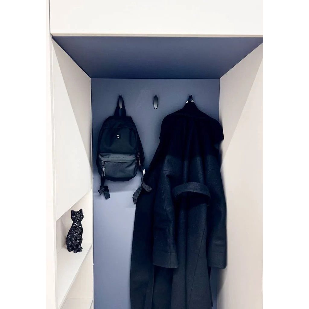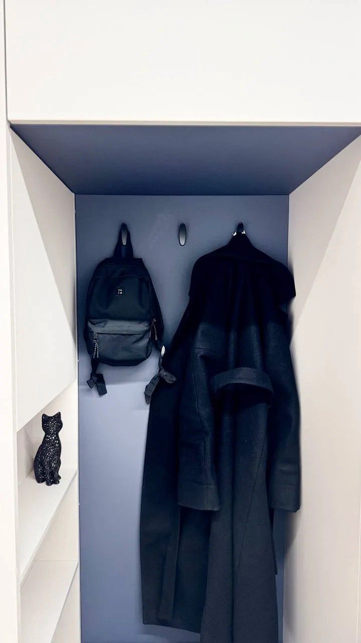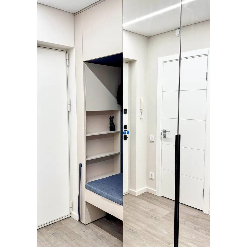 - Удобство: Встроенное сиденье из синего микровелюра — уютное место, чтобы присесть и переобуться.