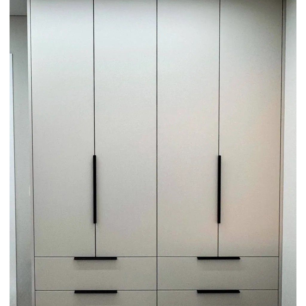 - Фурнитура: Выдвижные системы Hettich обеспечивают лёгкий доступ к содержимому, а чёрные торцевые ручки Dargroup добавляют строгости и контраста.