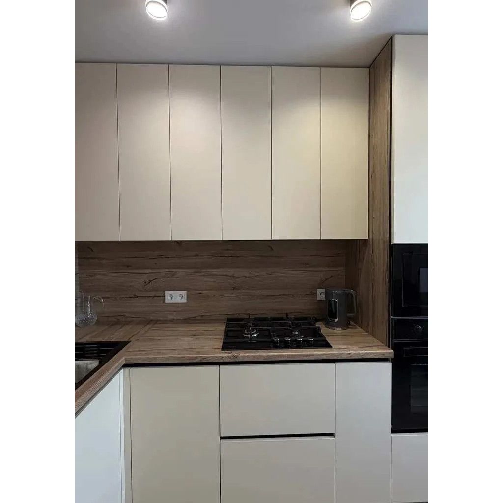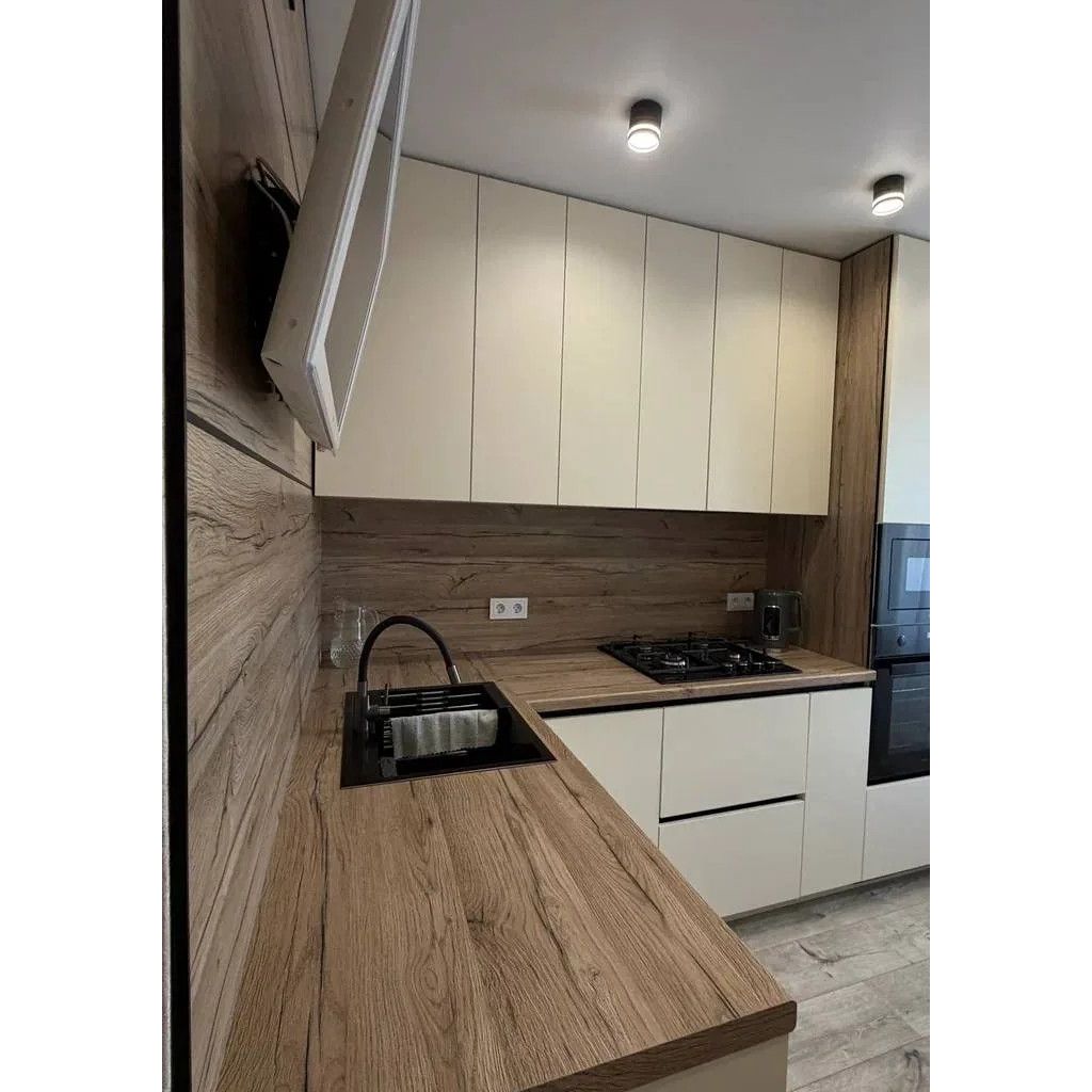 - Монолитная рабочая зона – Столешница и фартук в оттенке «Дуб Каре» с матовым финишем и непрерывным рисунком. Эффект цельного полотна зрительно расширяет пространство и упрощает уход.