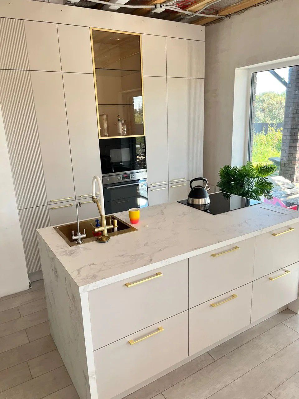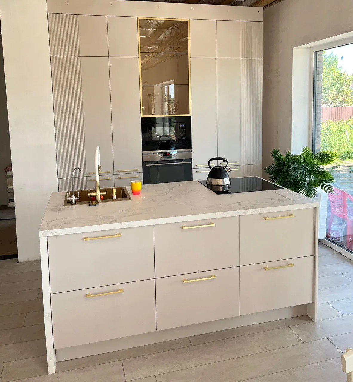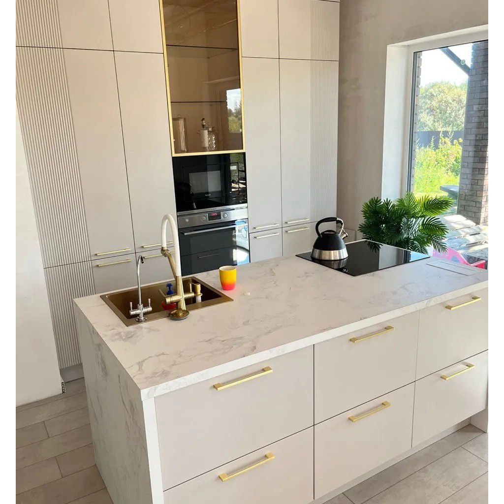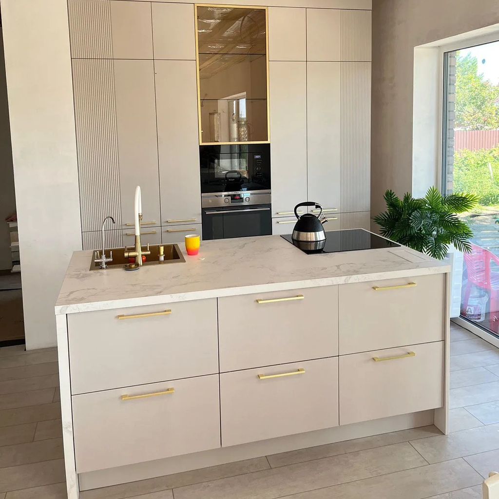 - Декор: Золотые ручки FS 639L — изящные вертикальные профили, добавляющие статусности и завершённости образу.