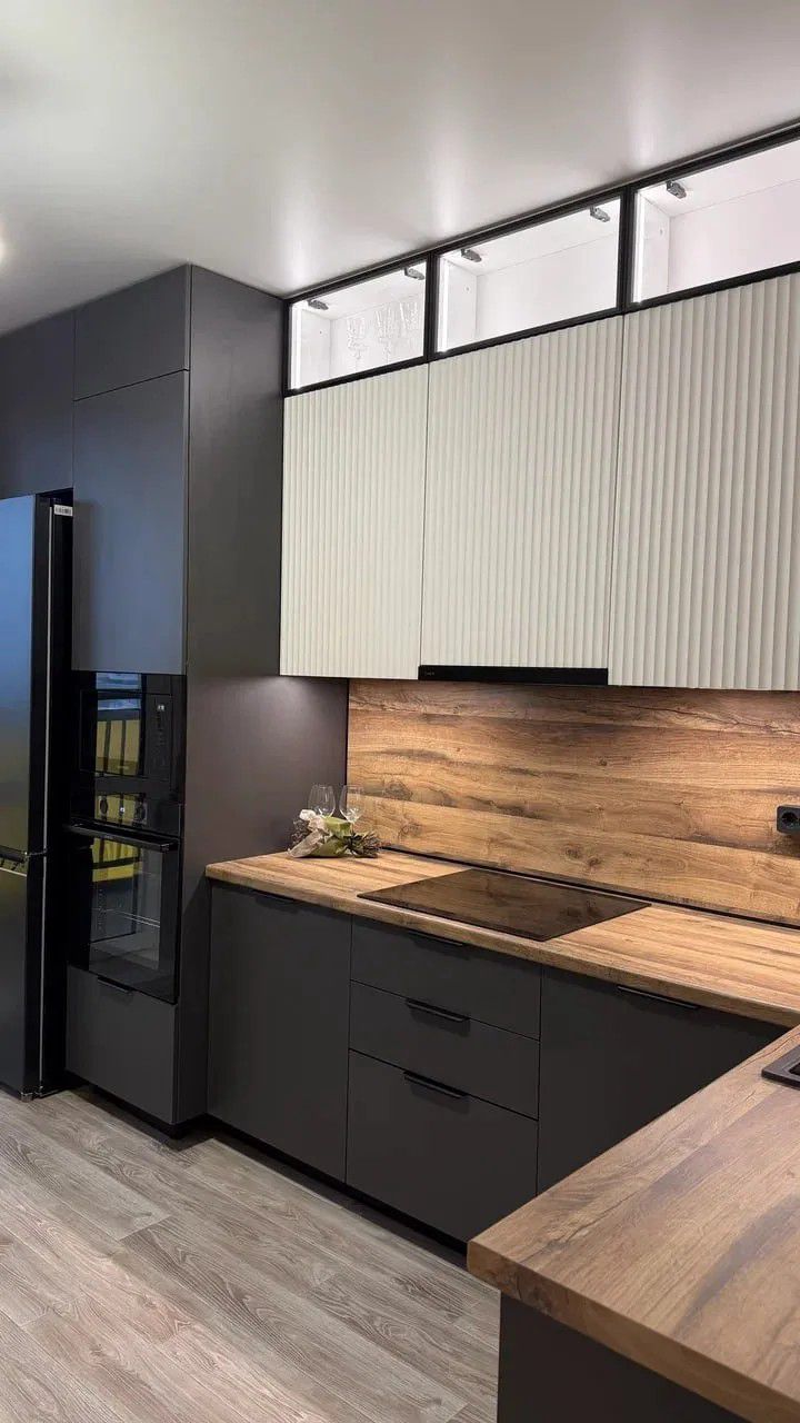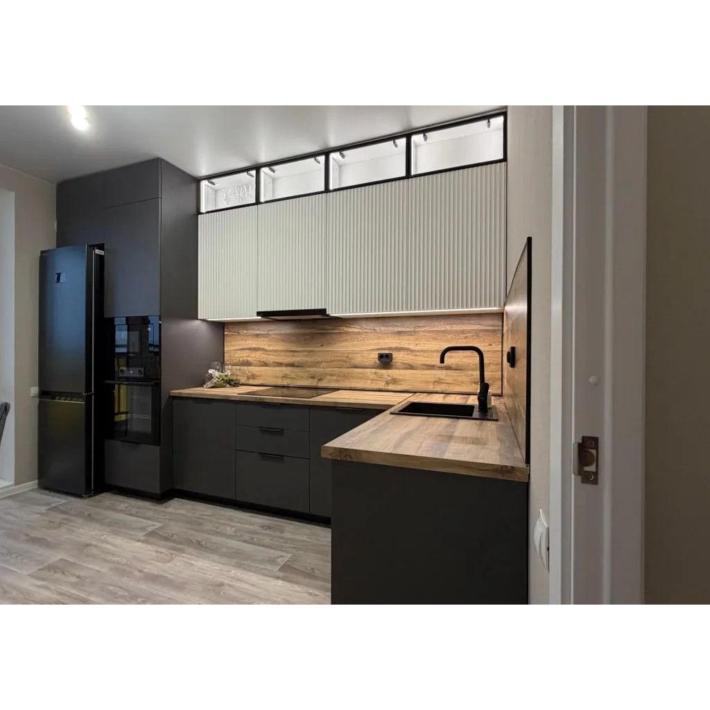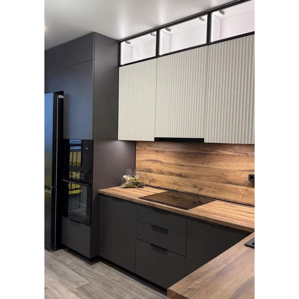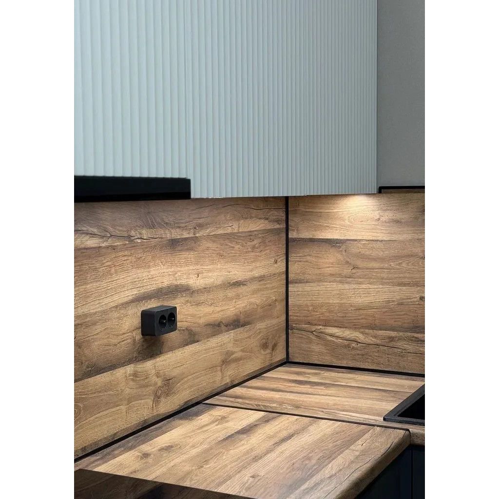 - Графичные акценты: чёрная кромка, угловая планка и плинтус — не просто декор, а продуманные детали, которые собирают композицию воедино и подчёркивают геометрию кухни.