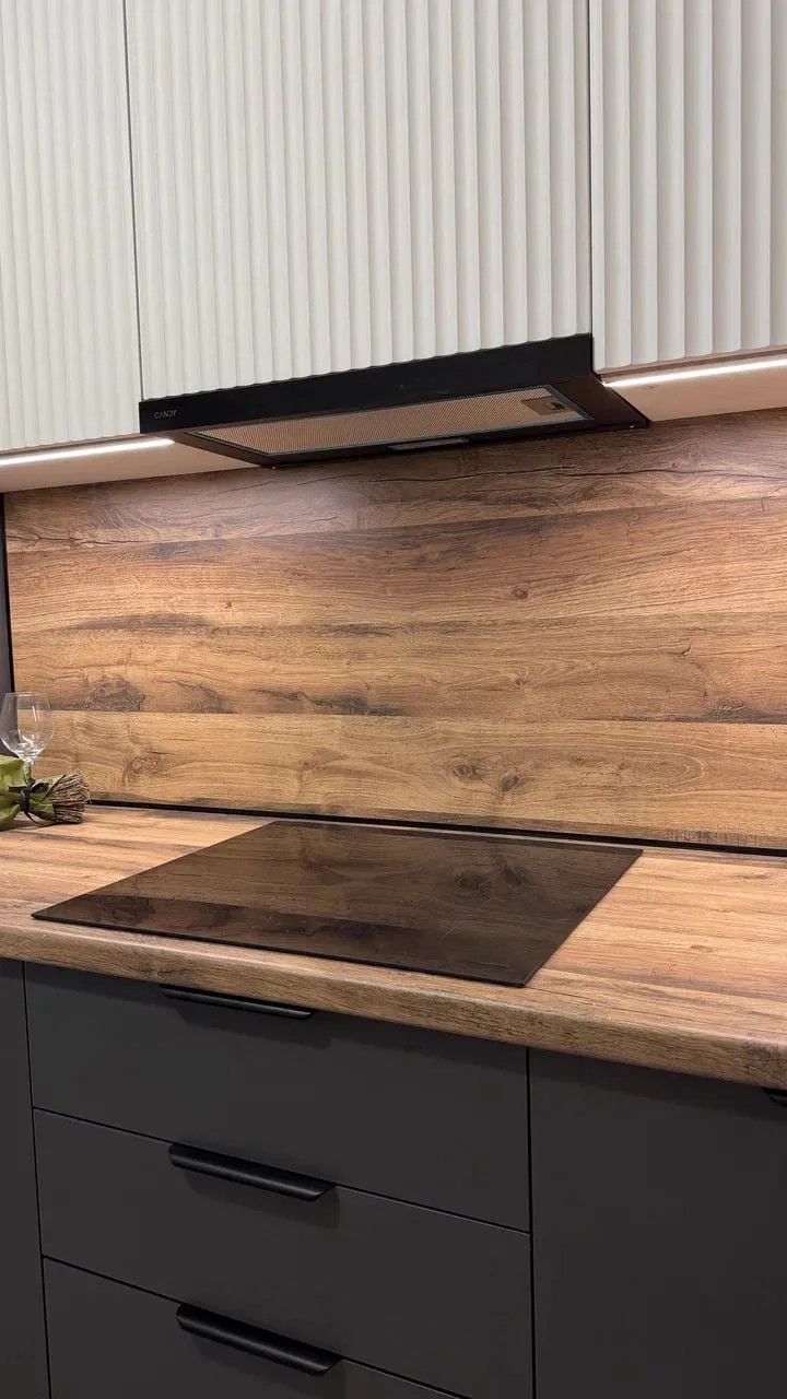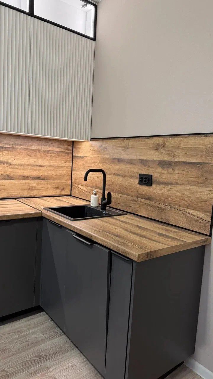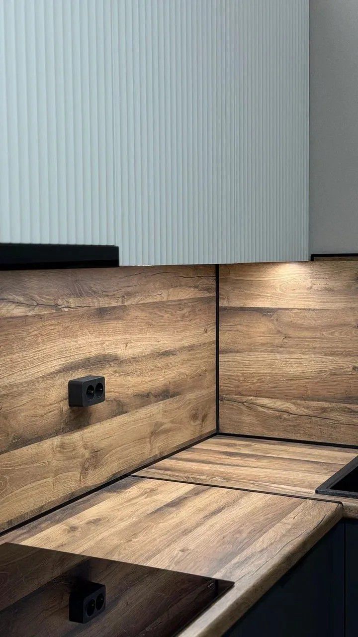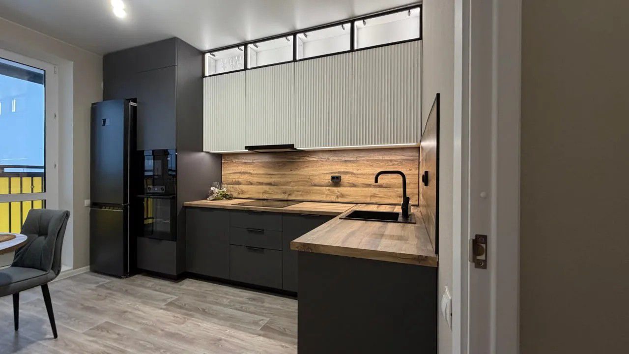 - Графичные акценты: чёрная кромка, угловая планка и плинтус — не просто декор, а продуманные детали, которые собирают композицию воедино и подчёркивают геометрию кухни.