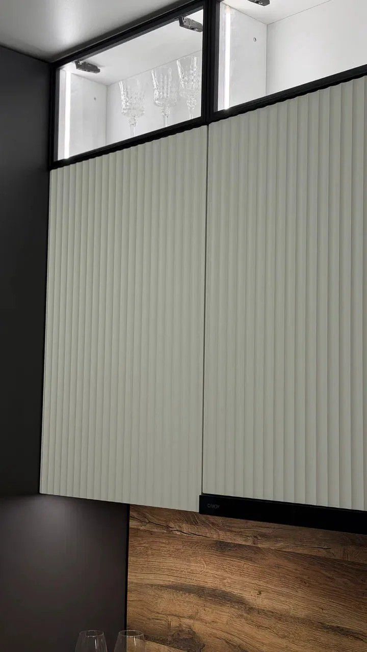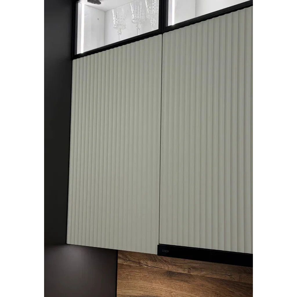 - Среднюю зону украшают рифлёные фасады типа 3D-2 в оттенке «Софт Милк», добавляющие интерьеру тактильную текстуру и мягкий светлый акцент.