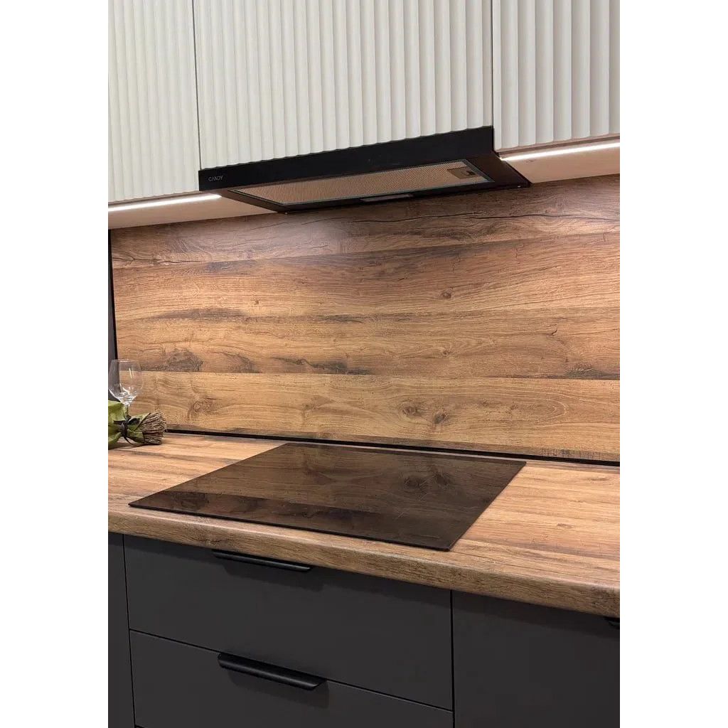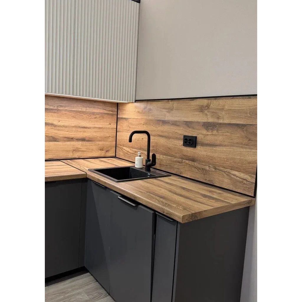 - Столешница и стеновая панель: скиф №932 «Дуб Корсика светлый мат» — натуральная текстура дерева в матовом исполнении, устойчивая к влаге, температуре и царапинам.