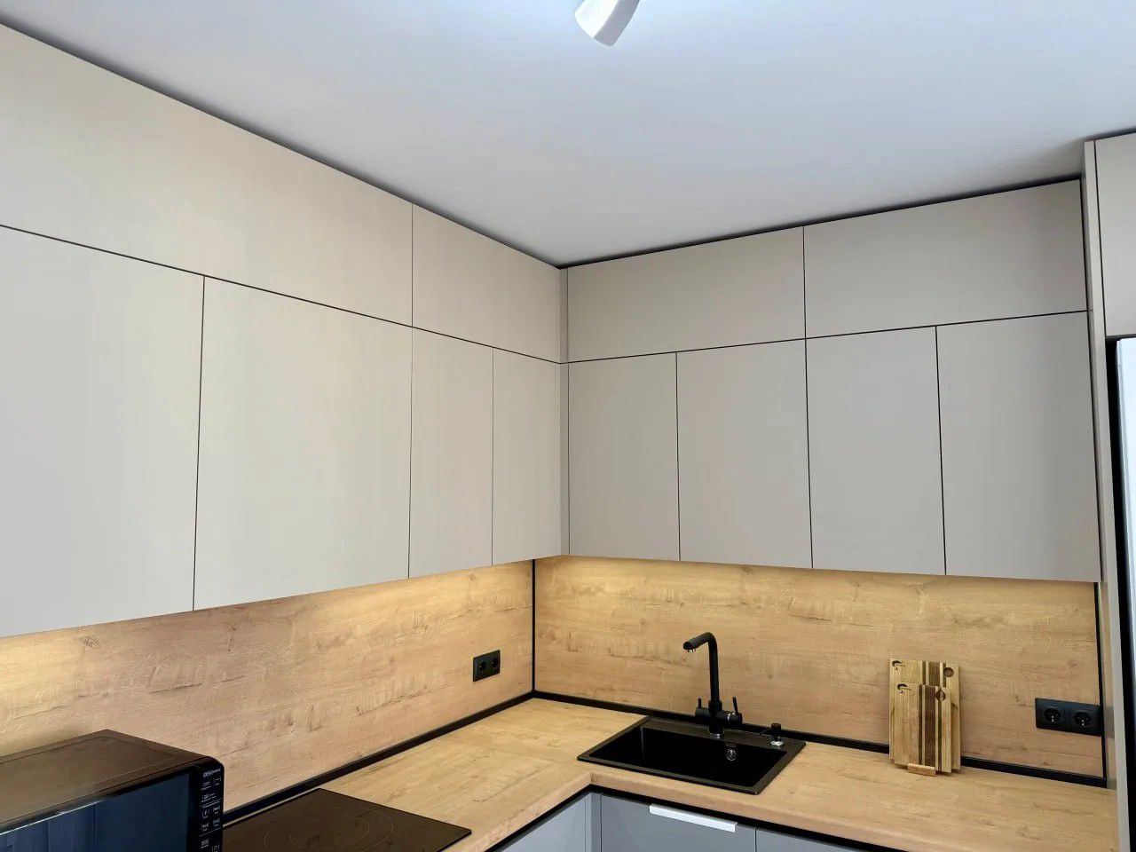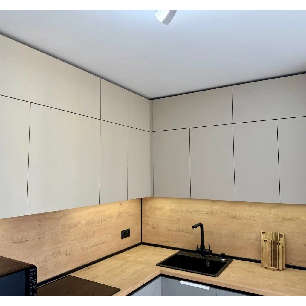 - Подсветка: Алюминиевый врезной профиль с рассеивателем под верхние шкафы + LED лента (отступ 20 мм) — атмосферное освещение рабочей зоны.
