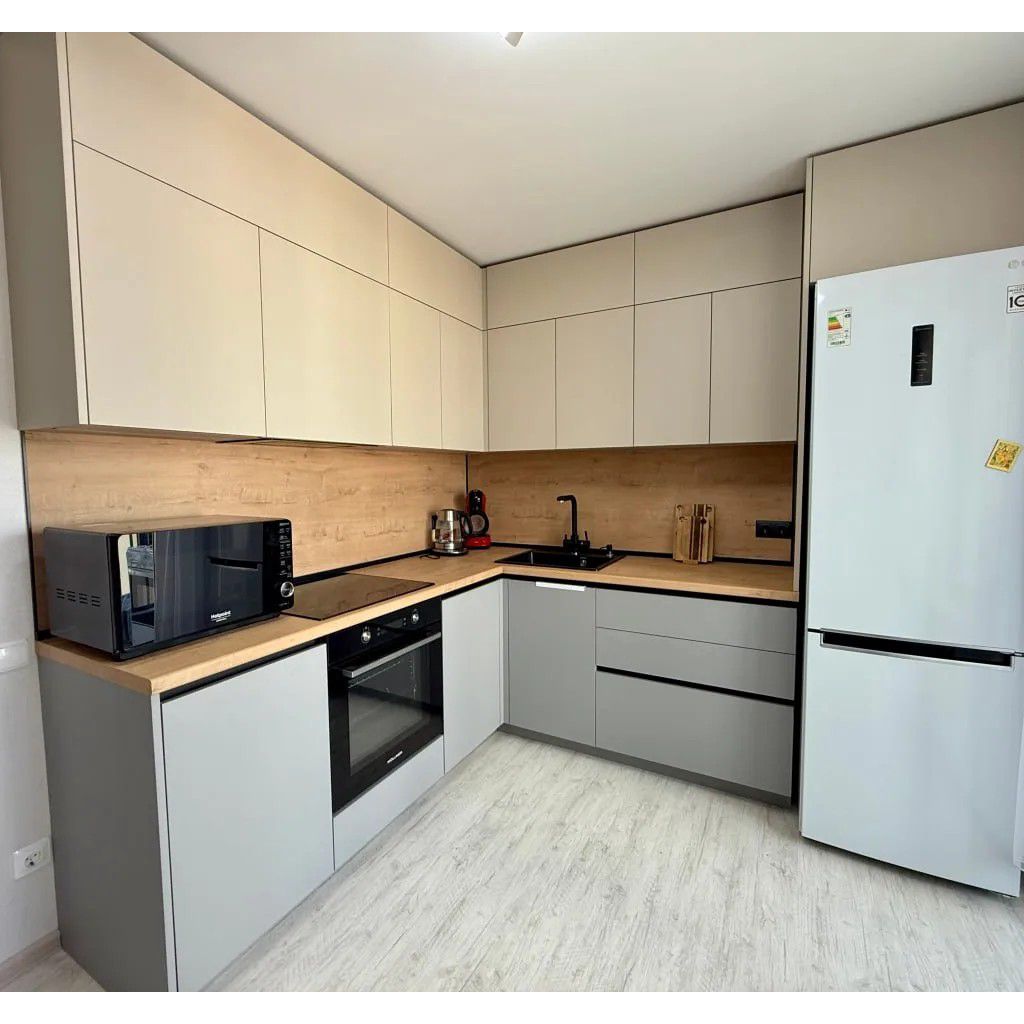 - Фасады: АГТ в матовой эмали. Верхние шкафы — светлый серый №729, нижние — глубокий матовый серый №399. Акценты белого RAL 9016 добавляют воздушности.