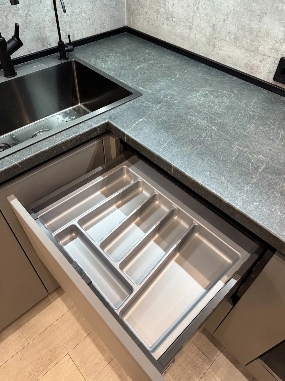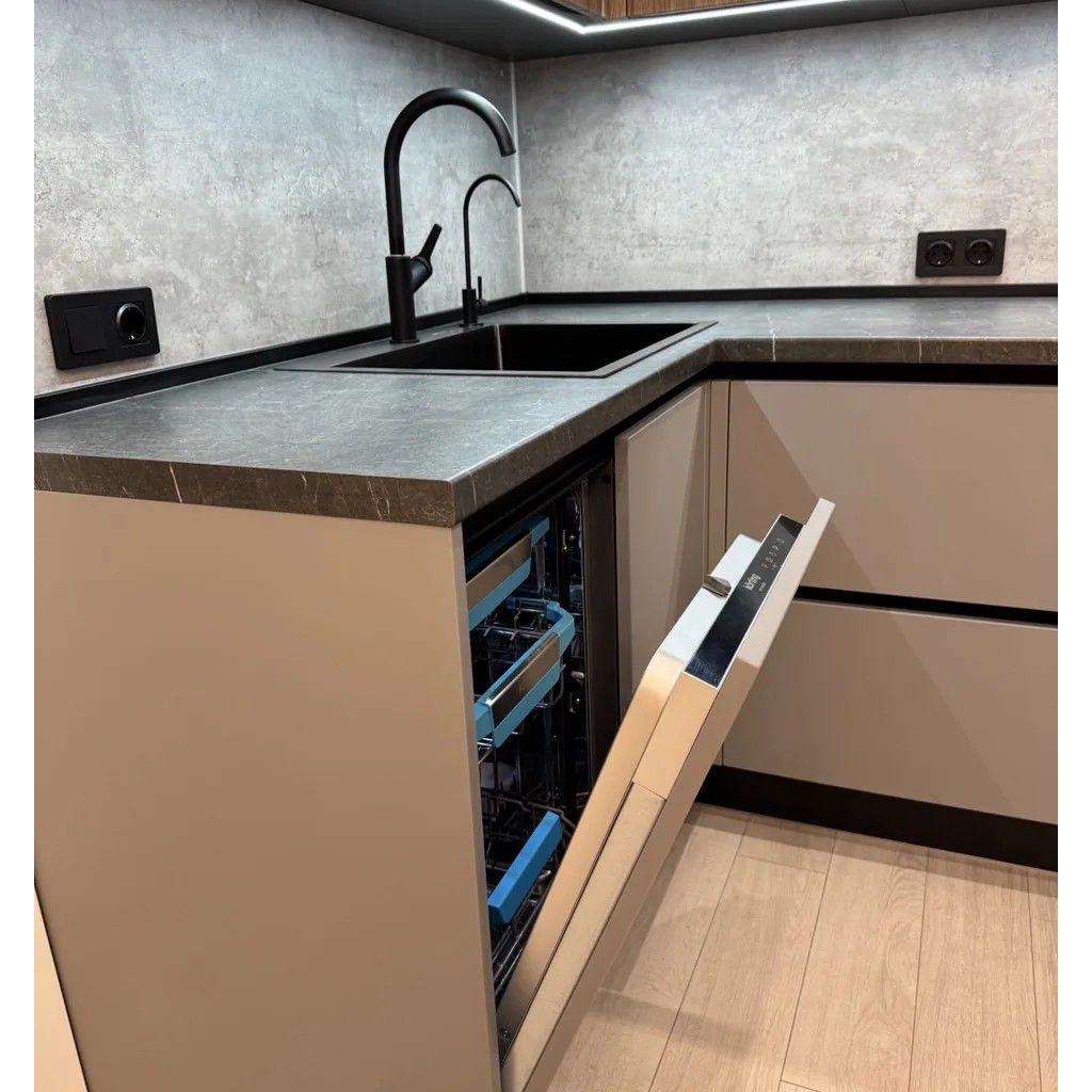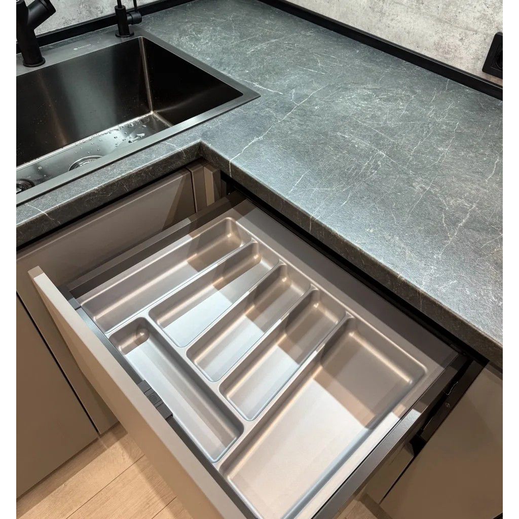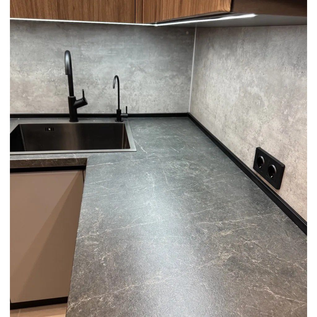 - Графитовая палитра: сочетание корпуса, профиля и мойки создаёт целостный и строгий образ.