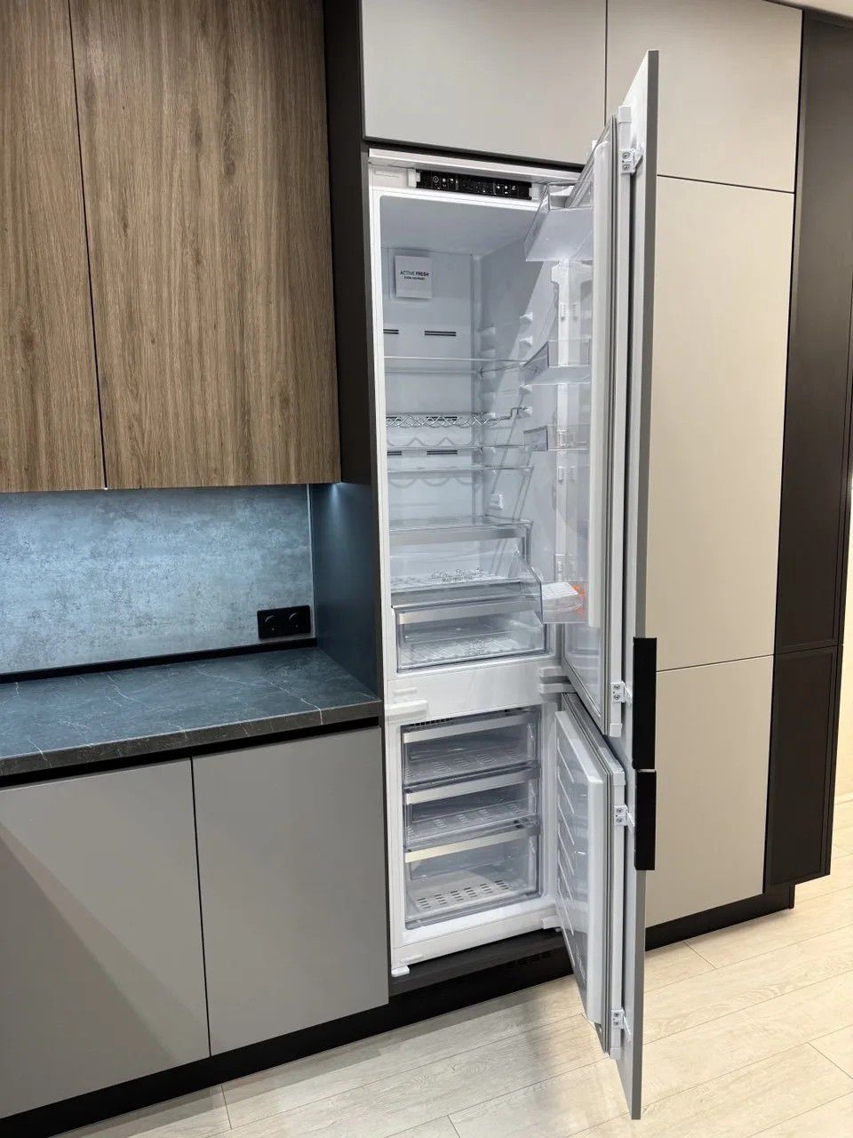 - Декор: Витрина с серым стеклом сатин и чёрным матовым профилем RF8 — добавляет лёгкости и статусности. Чёрный алюминиевый плинтус «Квадро» завершает индустриальный образ.