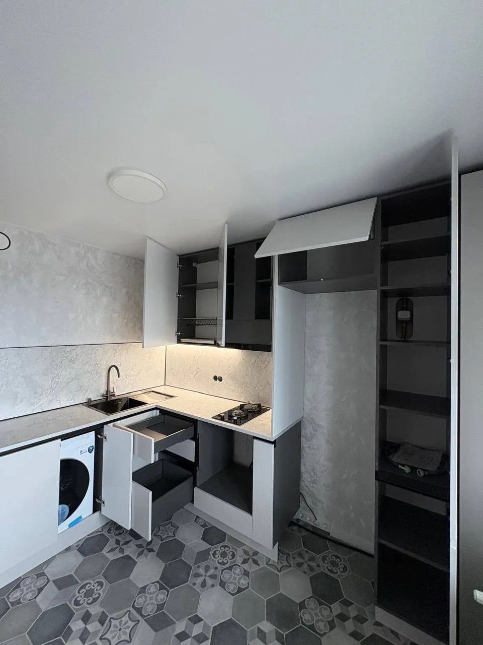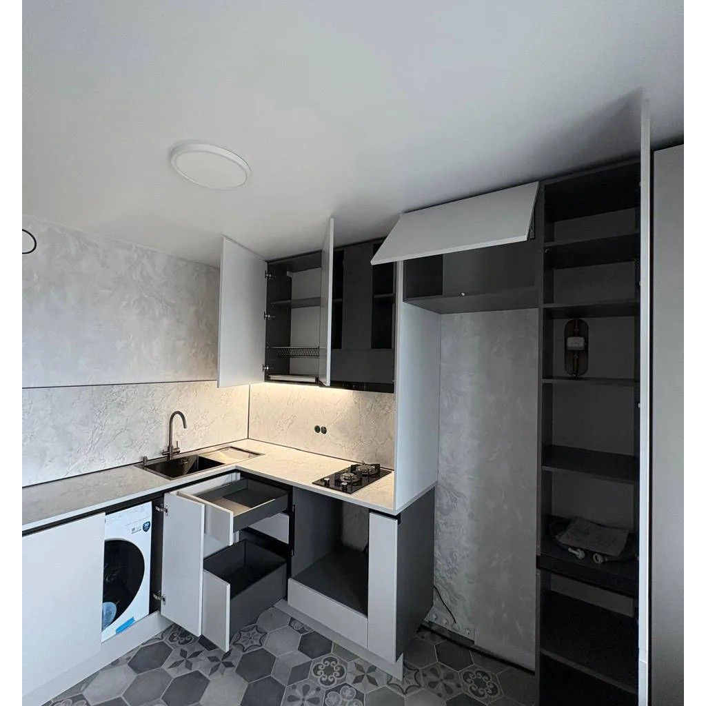 - Обработка столешницы: Аккуратный еврозапил угла + серая кромка Rehau — защита от влаги и эстетичный финиш.