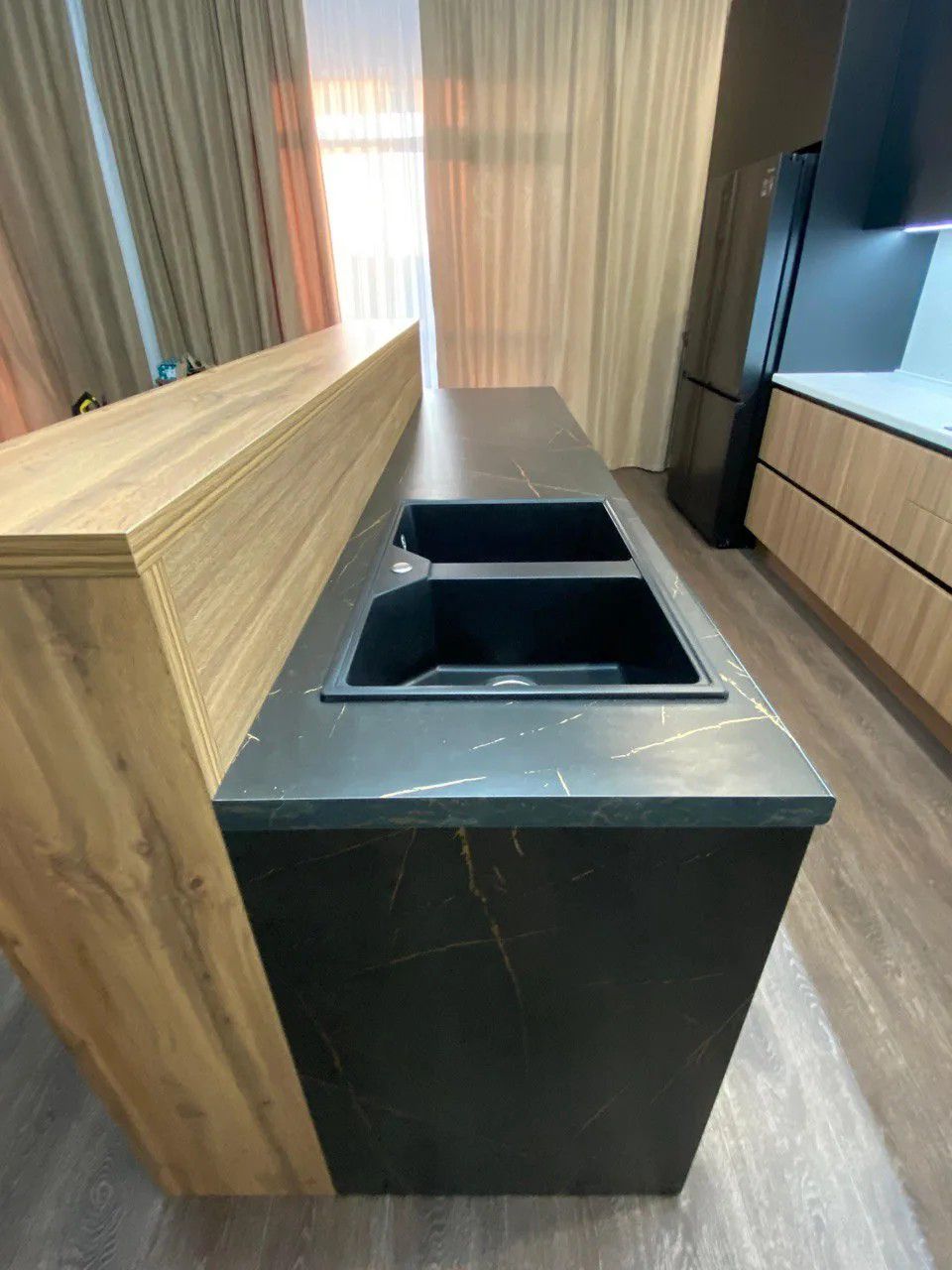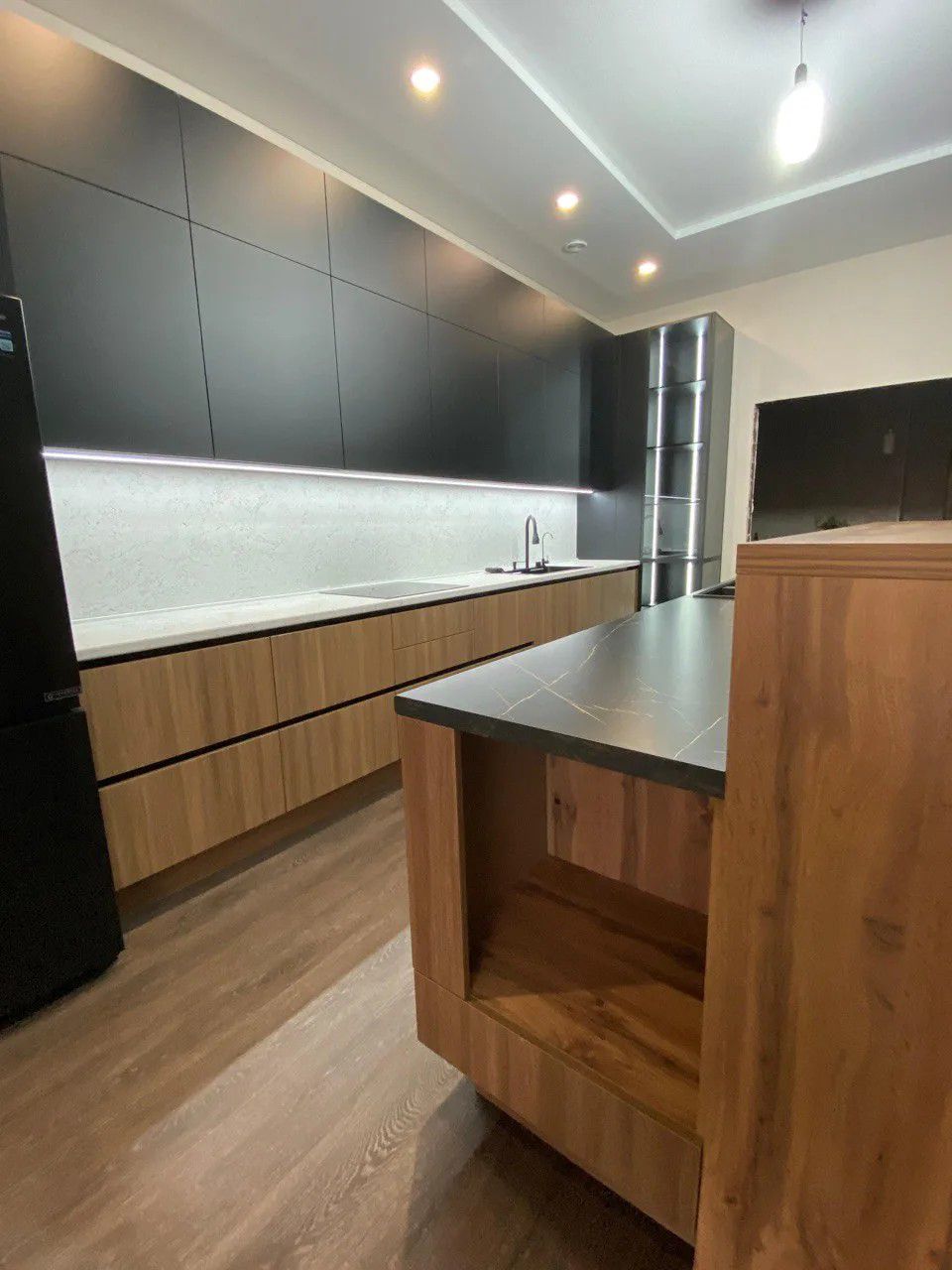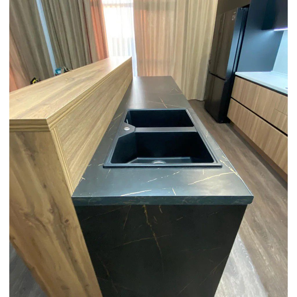 Кухня «NOIR PERU» — это воплощение современного стиля и благородной эстетики. Контрастный дуэт глубокого чёрного матового цвета и тёплых оттенков дуба создаёт интерьер с характером: элегантный, строгий и одновременно уютный. Это пространство для тех, кто ценит премиальное качество, продуманную эргономику и внимание к деталям.