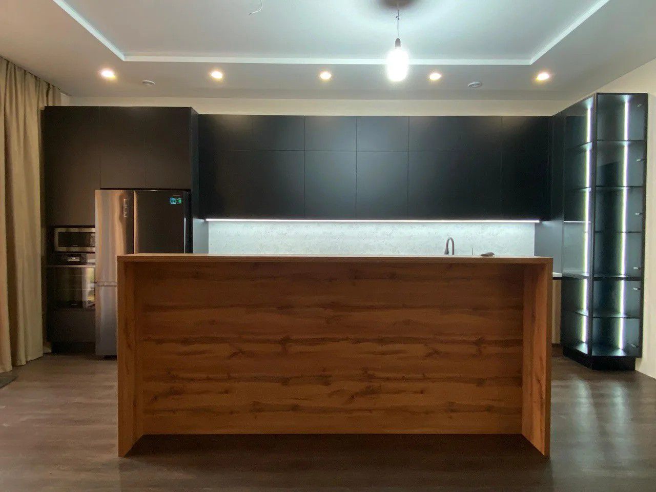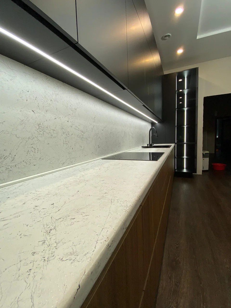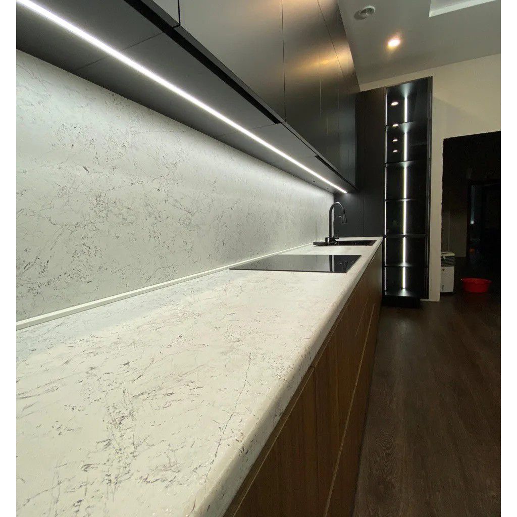 - Освещение: Врезной профиль под светодиодную ленту с рассеивателем (под витрину и верхние шкафы) — создаёт атмосферную подсветку рабочей зоны.