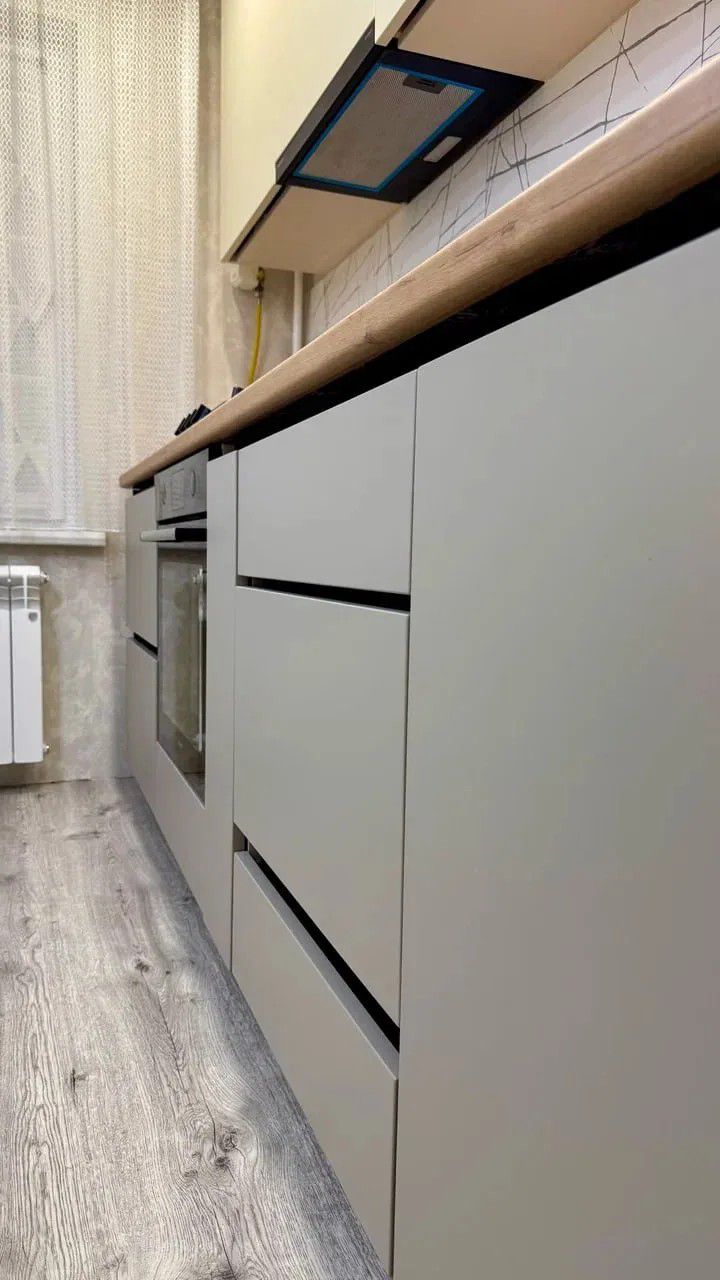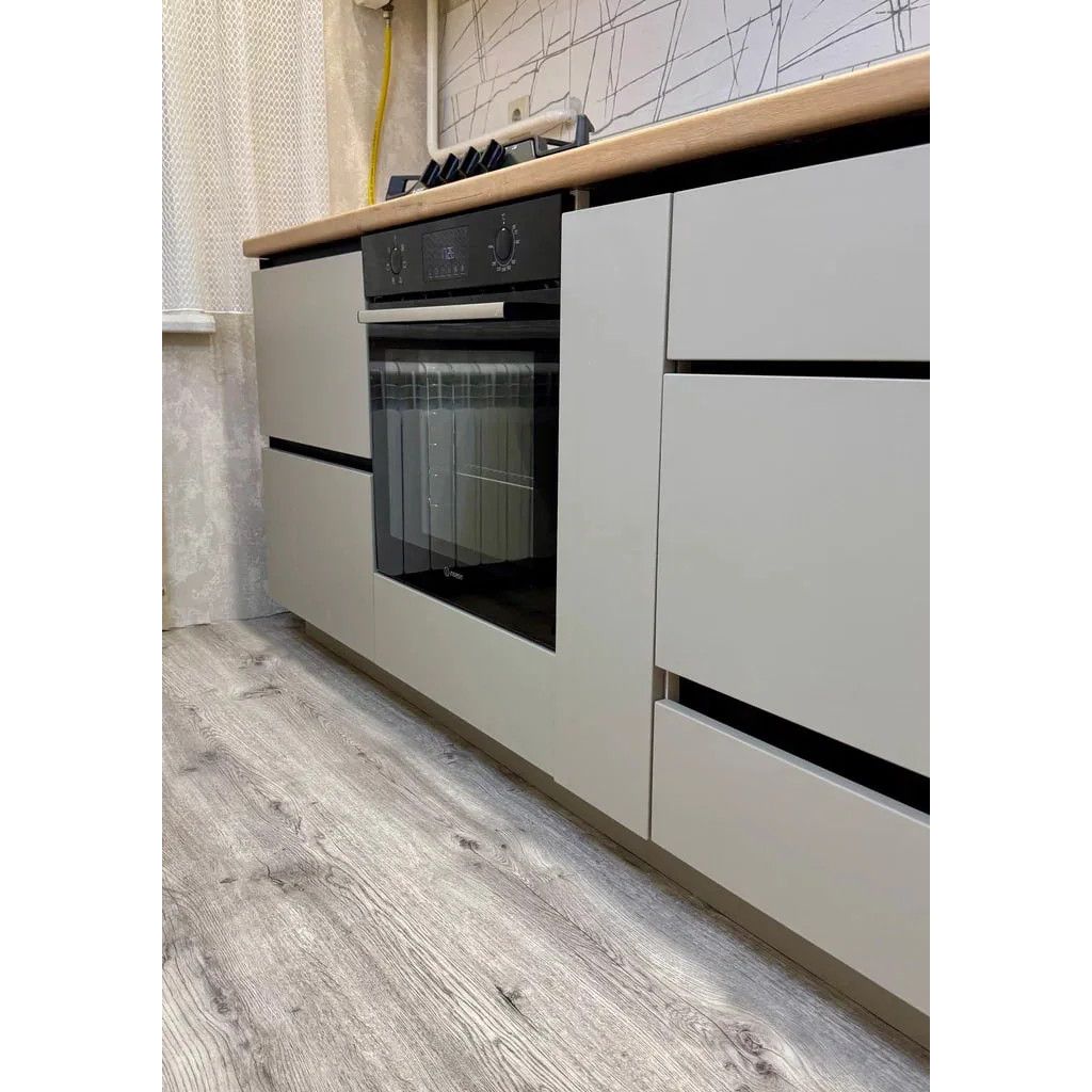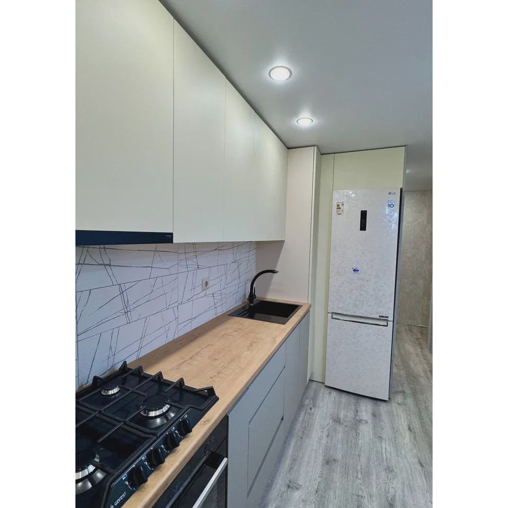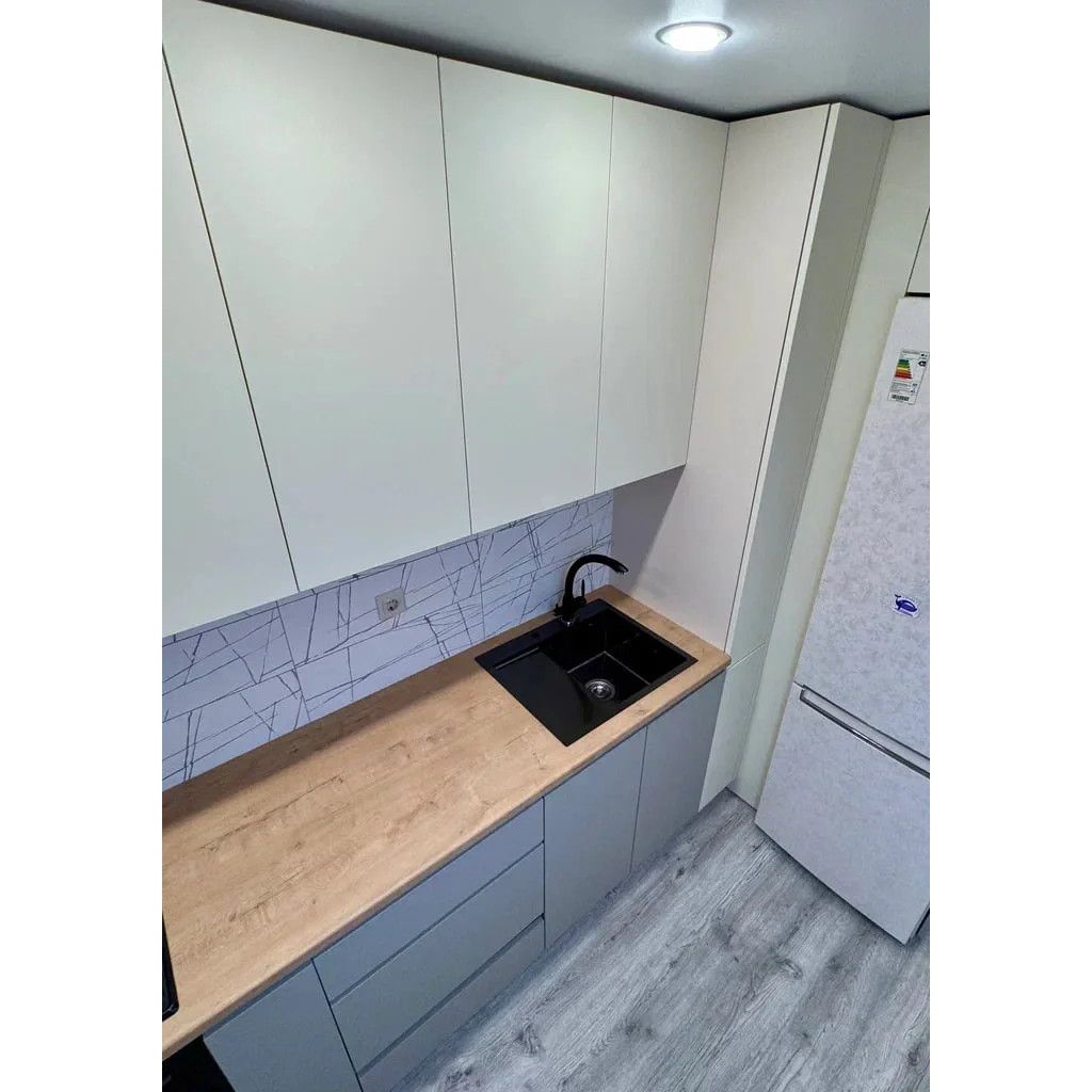- Фасады: МДФ с покрытием — ровные, гладкие поверхности, устойчивые к влаге и перепадам температур. Они визуально делают кухню лёгкой, современной и приятной на ощупь.