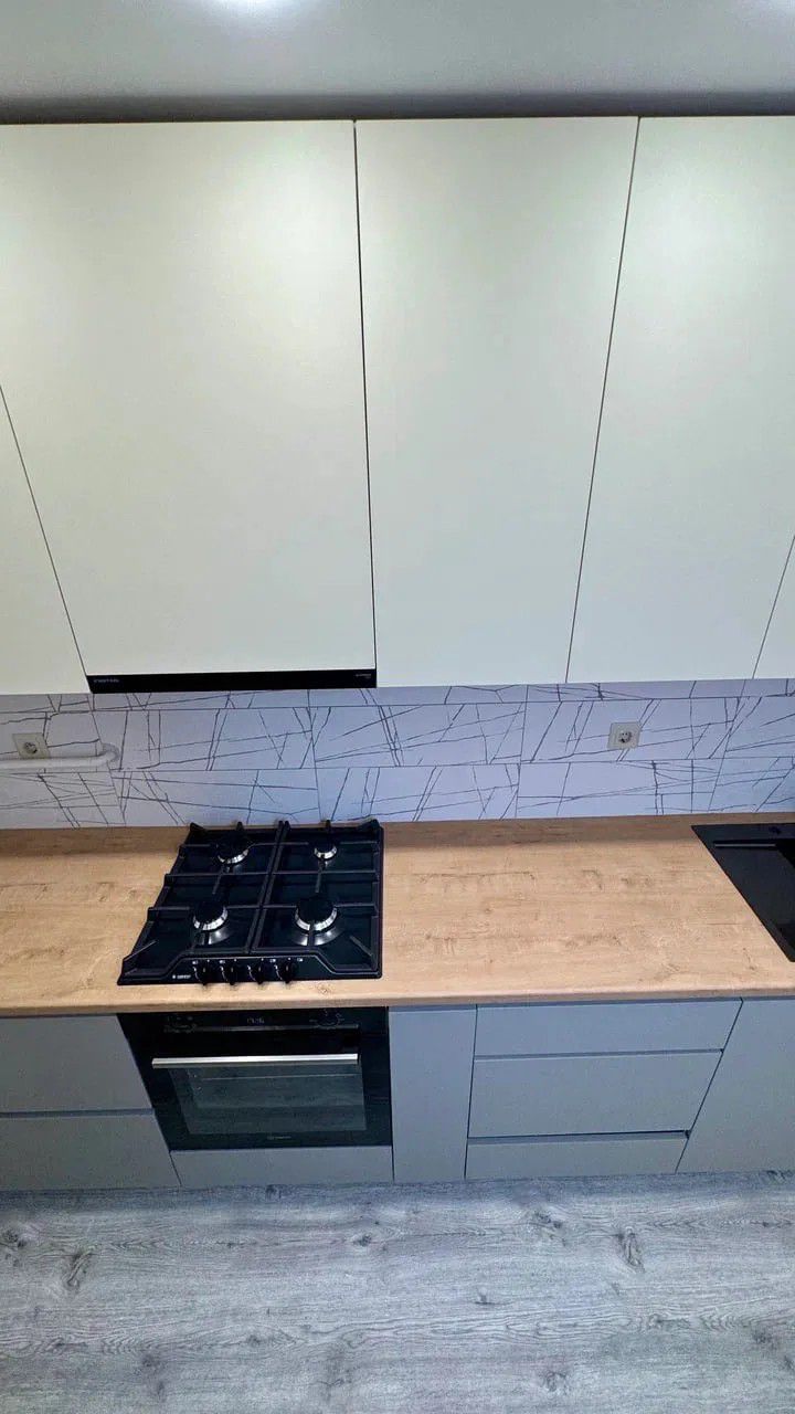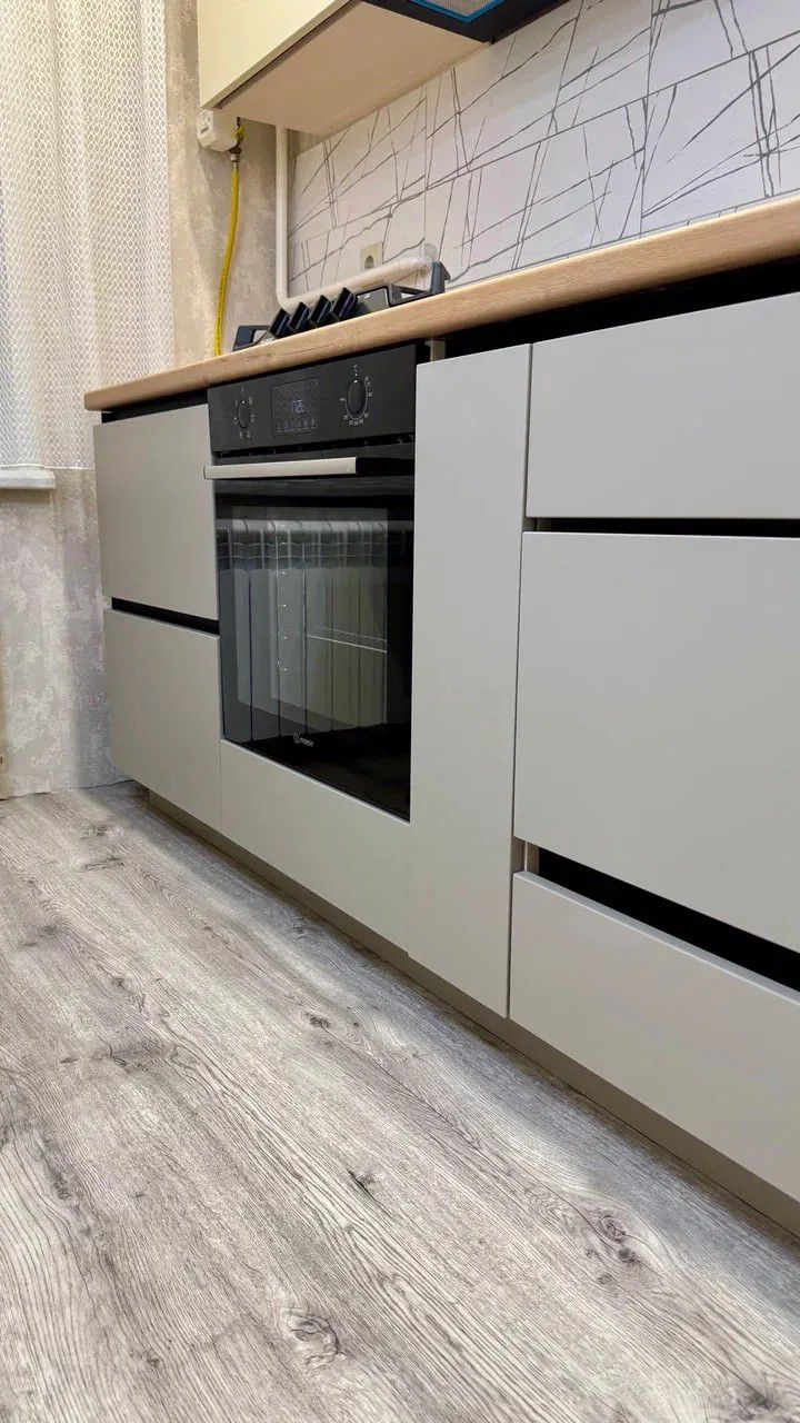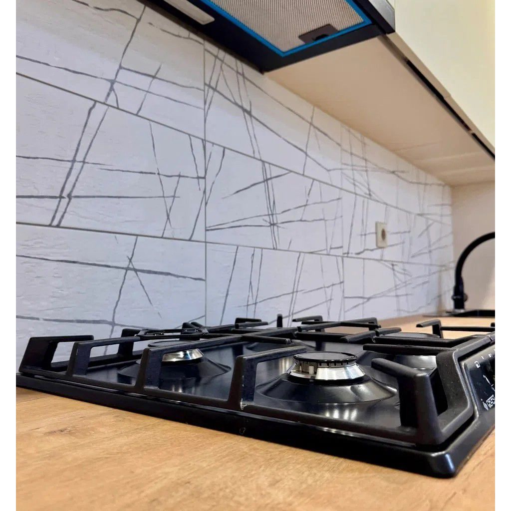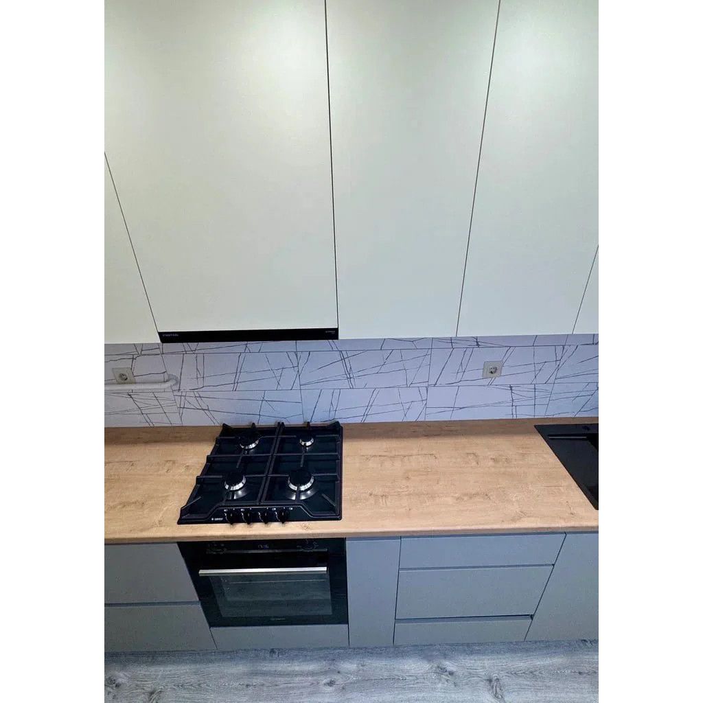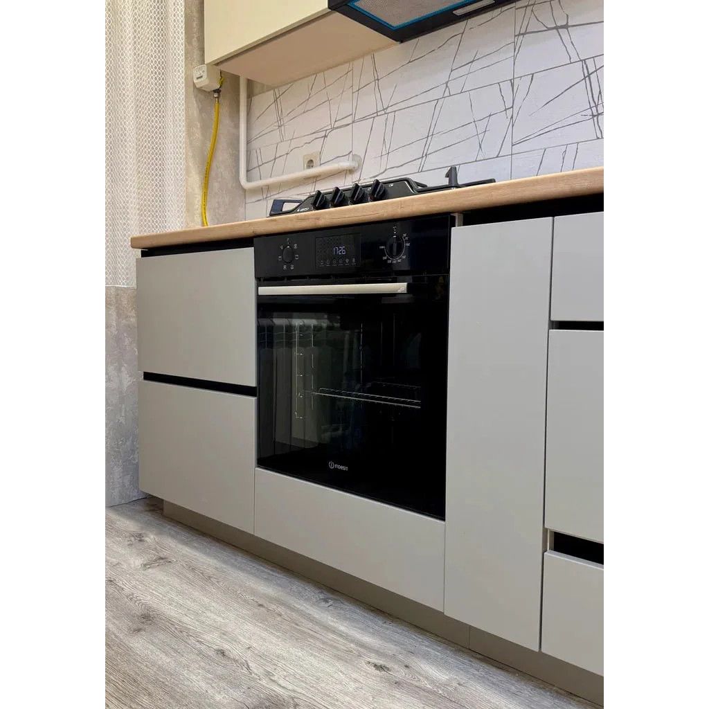 - Фасады: МДФ с покрытием — ровные, гладкие поверхности, устойчивые к влаге и перепадам температур. Они визуально делают кухню лёгкой, современной и приятной на ощупь.