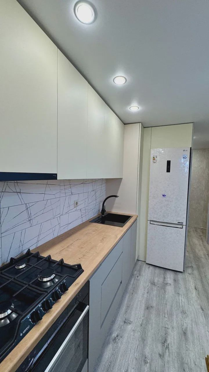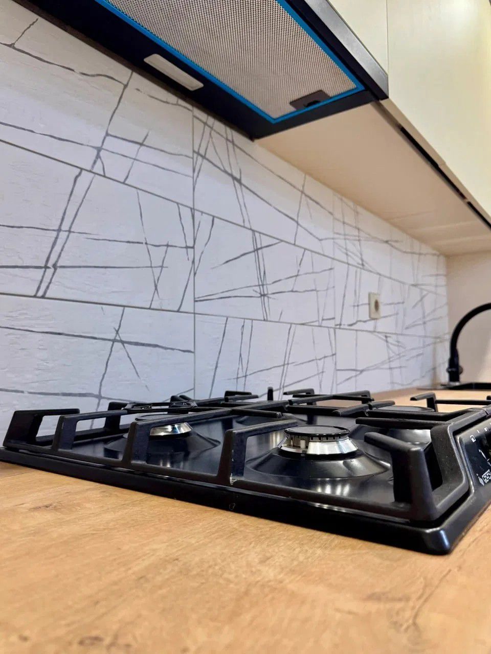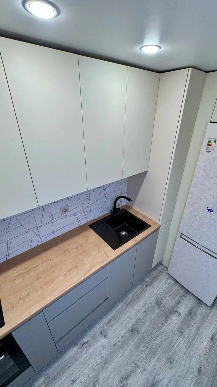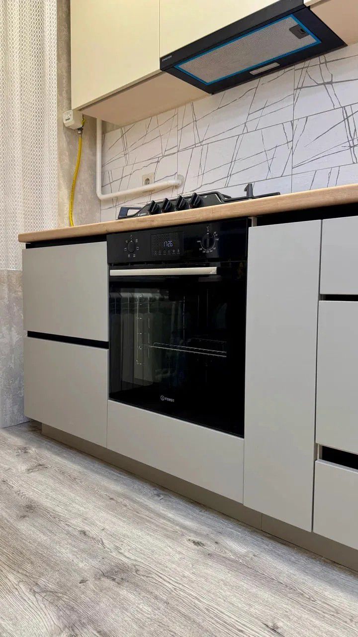 - Фасады: МДФ с покрытием — ровные, гладкие поверхности, устойчивые к влаге и перепадам температур. Они визуально делают кухню лёгкой, современной и приятной на ощупь.