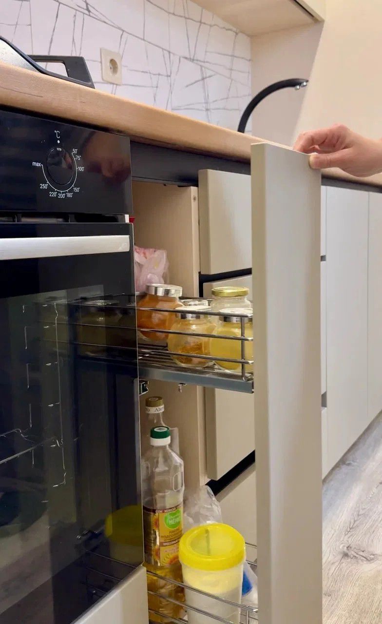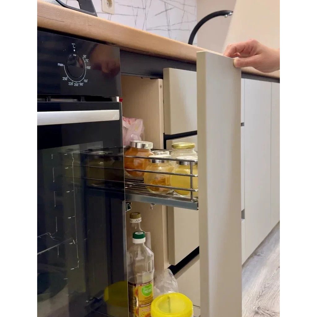 - Продуманная организация: Внутреннее пространство шкафов зонировано для удобного хранения посуды и продуктов.