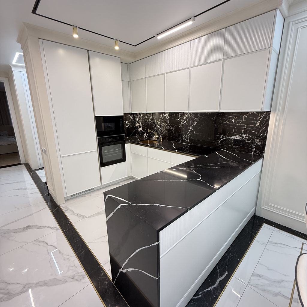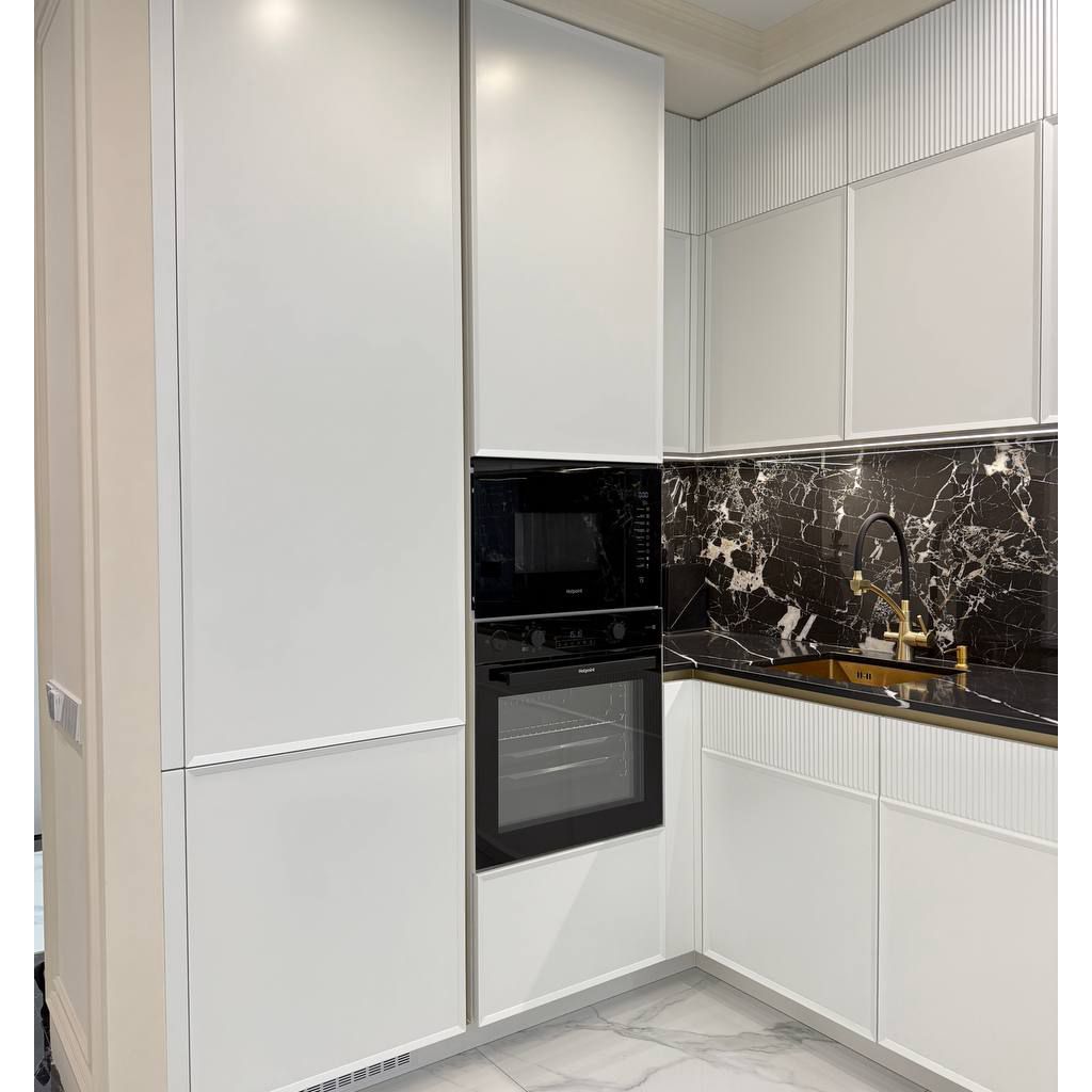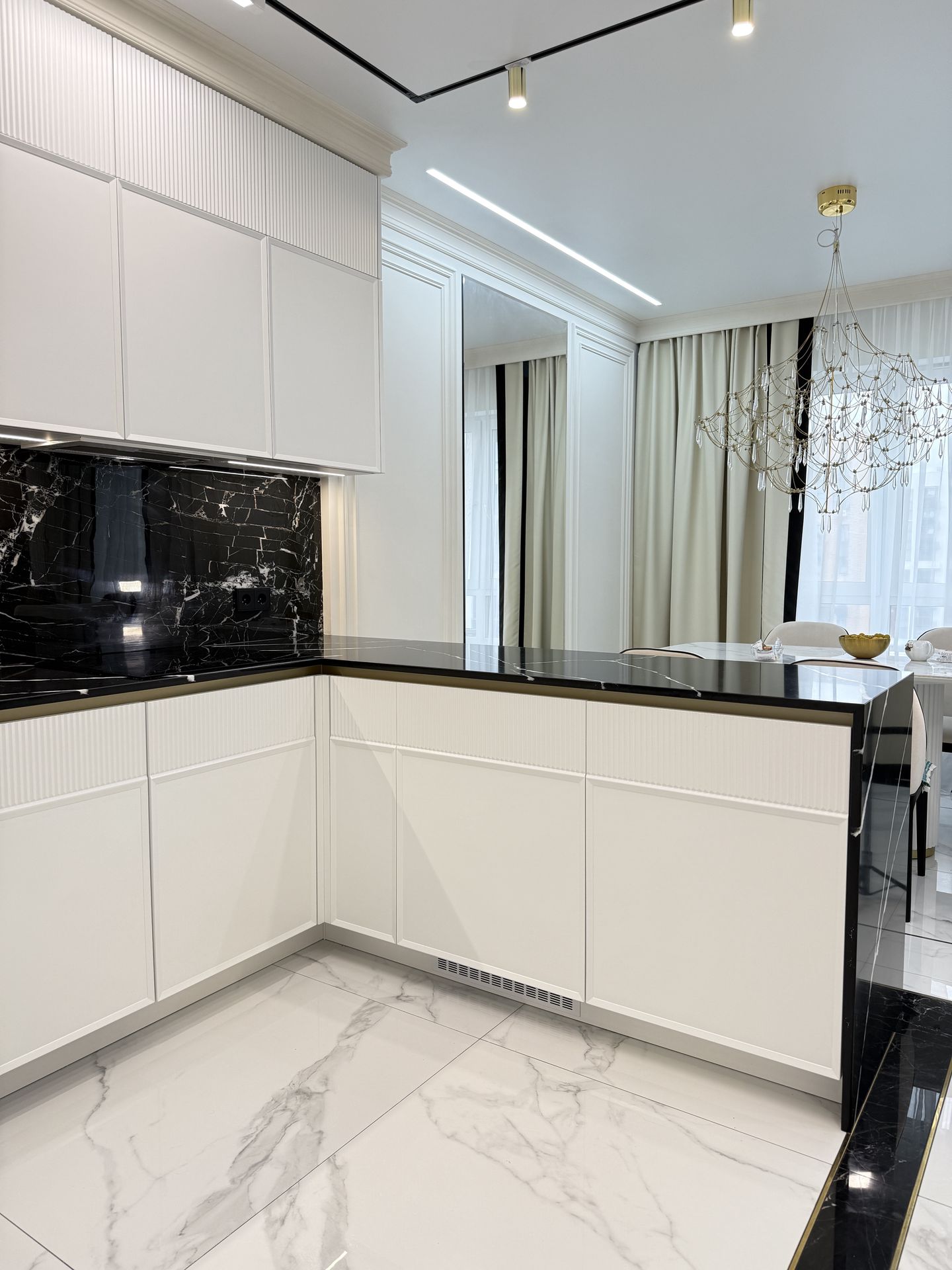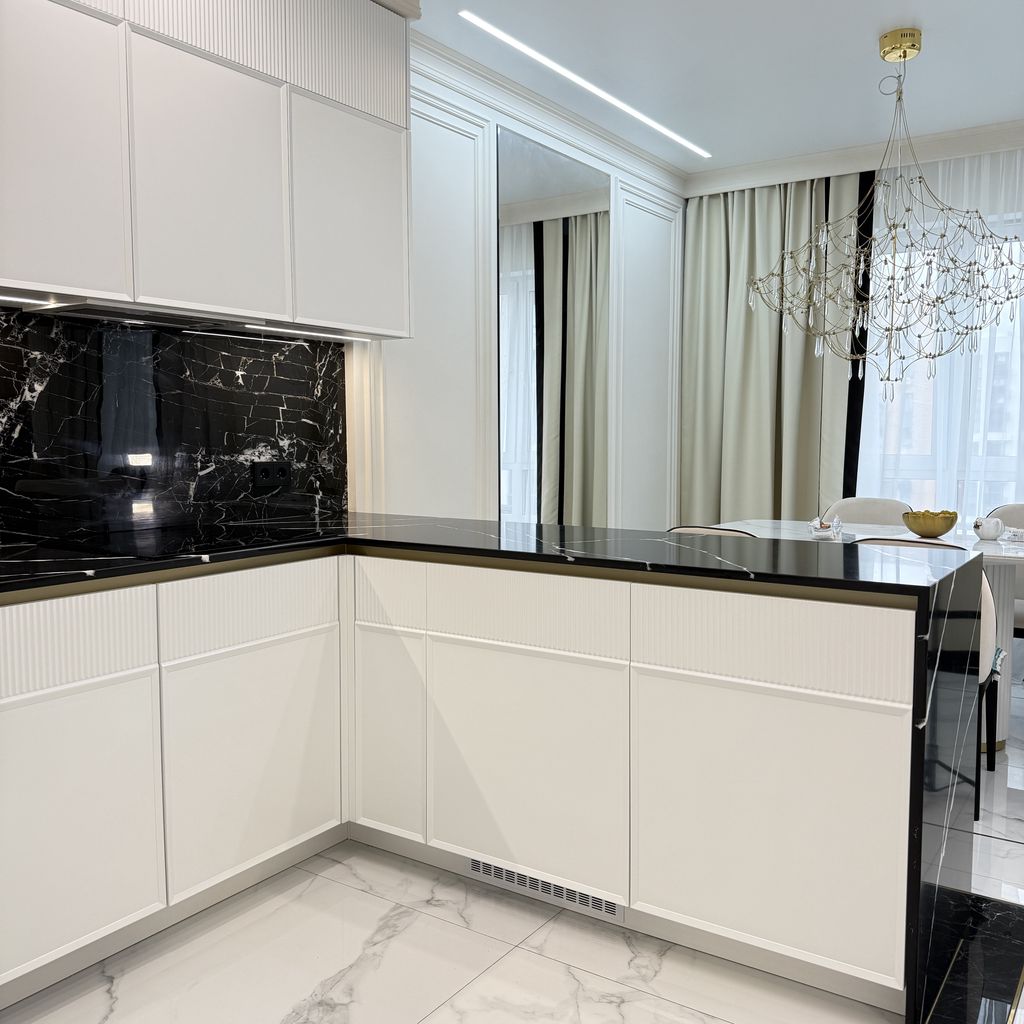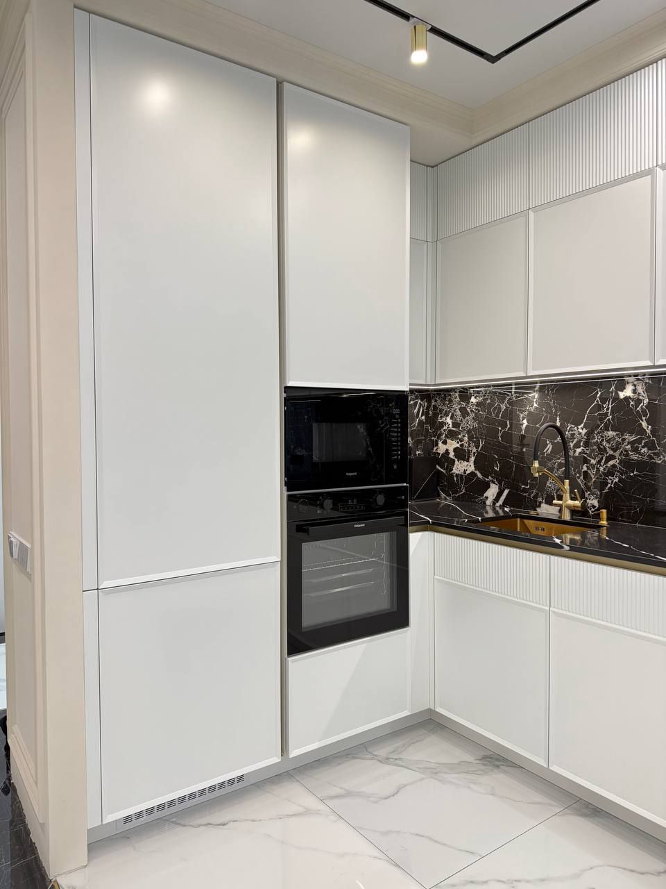 Этот проект — наглядное доказательство того, как индивидуальный подход и внимание к деталям создают не просто кухню, а гармоничное пространство для жизни. Интерьер, построенный на контрастах и чистоте линий, сочетает в себе лаконичность современного стиля и утонченную элегантность.