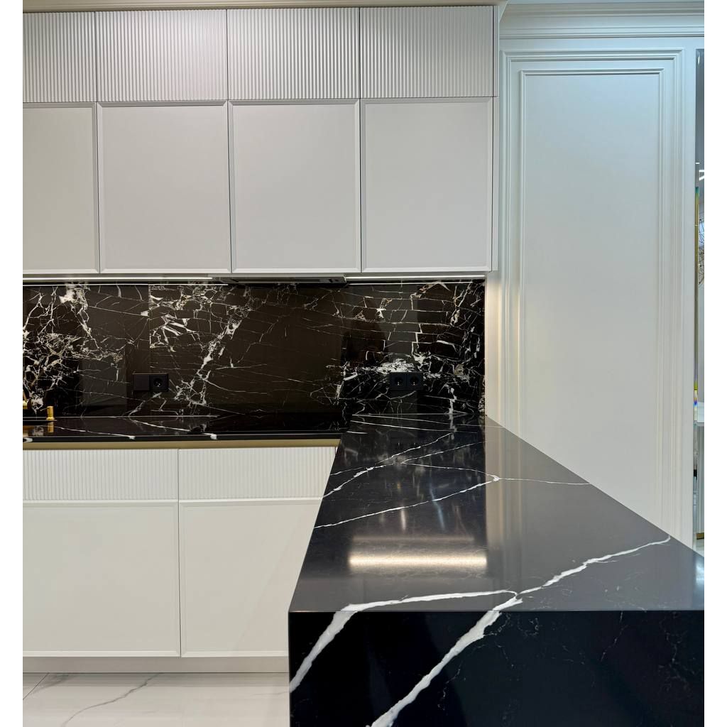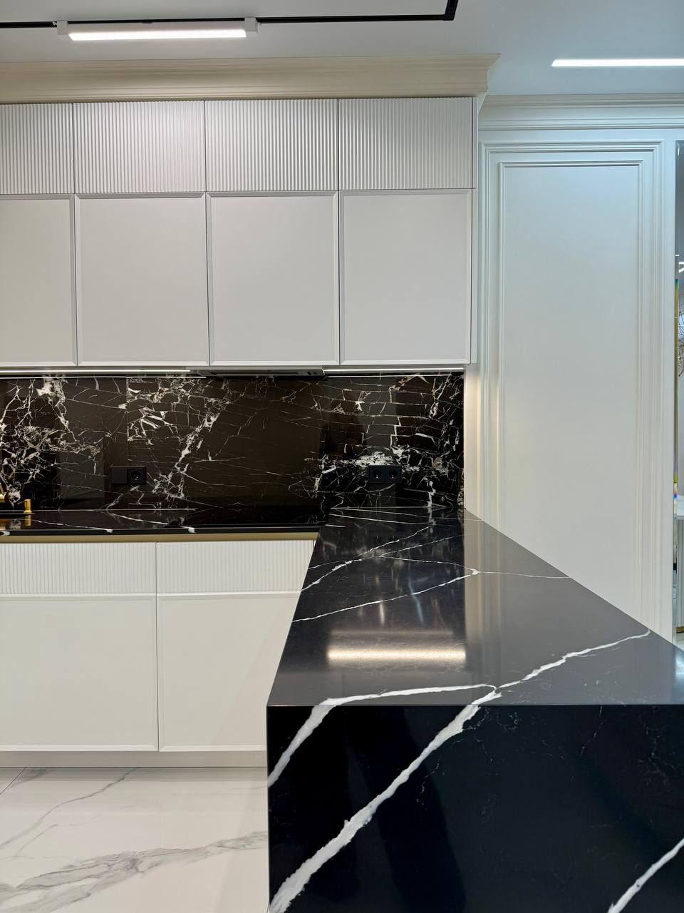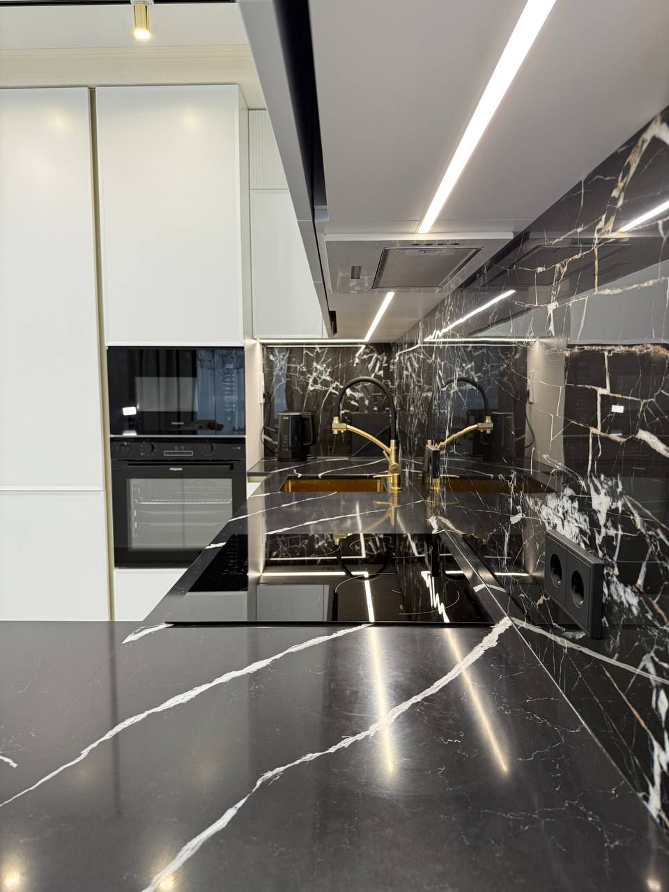 Столешница и фартук: Кварцевый агломерат (20 мм) и крупноформатный керамогранит — абсолютная устойчивость к влаге, температуре и механическим воздействиям.