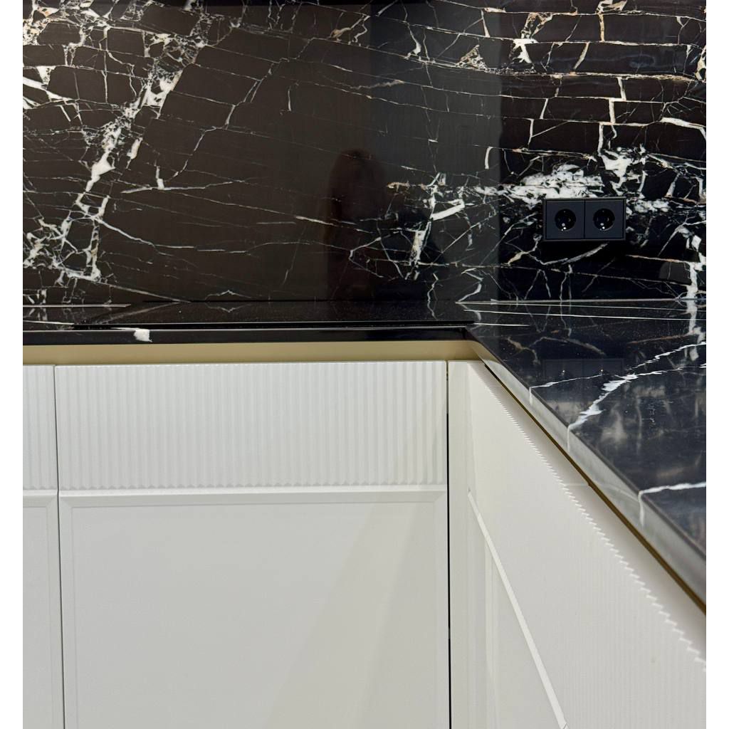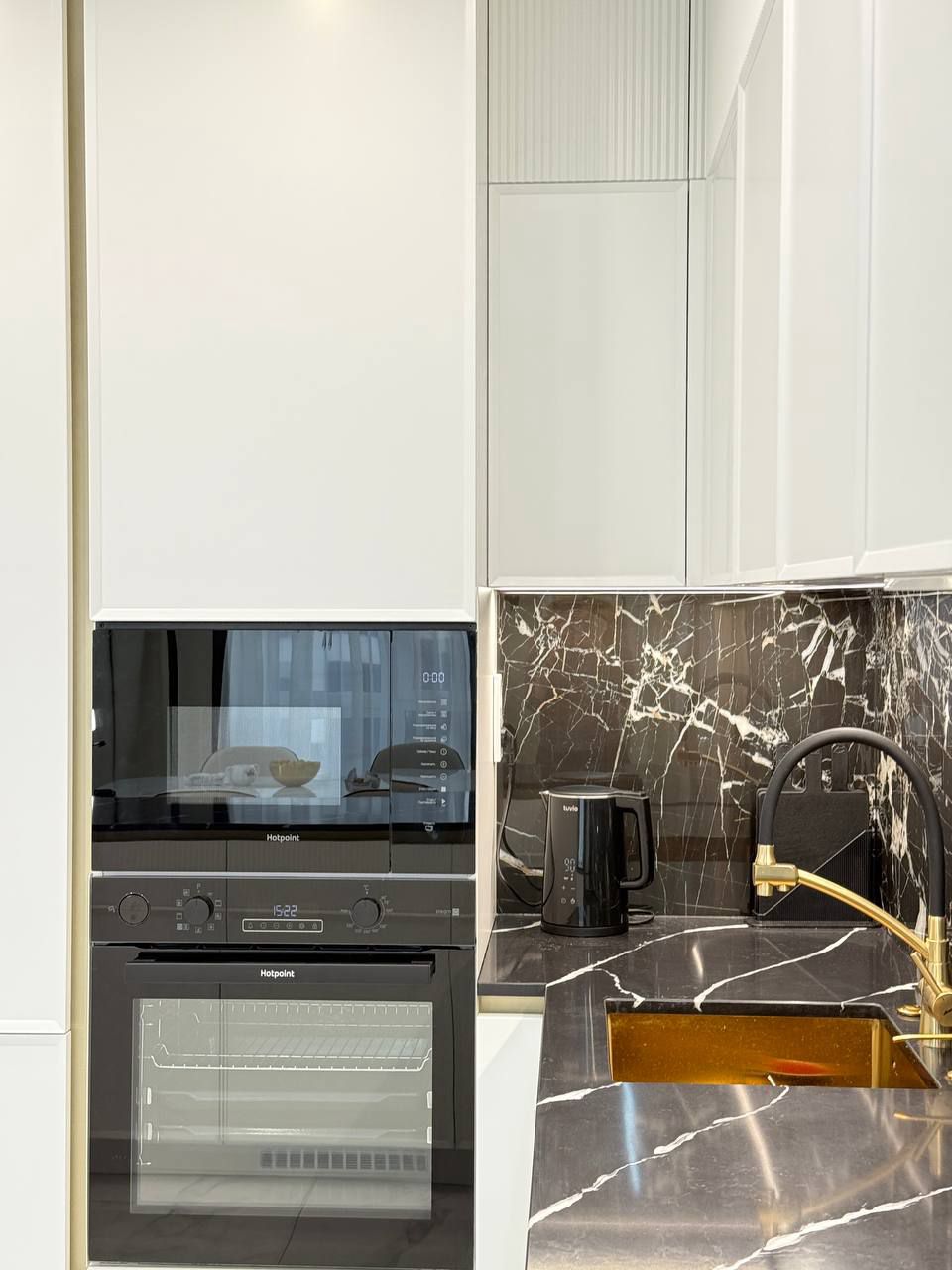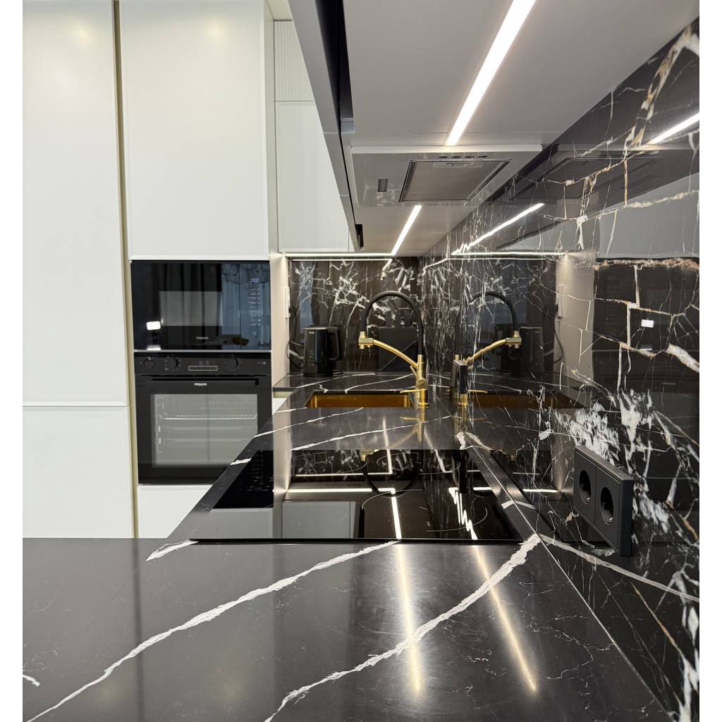 Яркий акцент, оживляющий пространство, — золотой профиль Gola, который заменяет традиционные ручки. Он подчеркивает минималистичный «безручковый» стиль и вносит ноту благородной роскоши. Контрастную выразительность интерьеру придает столешница и фартук из кварцевого камня с графичными прожилками, напоминая о классической элегантности чёрного платья с безупречными аксессуарами.