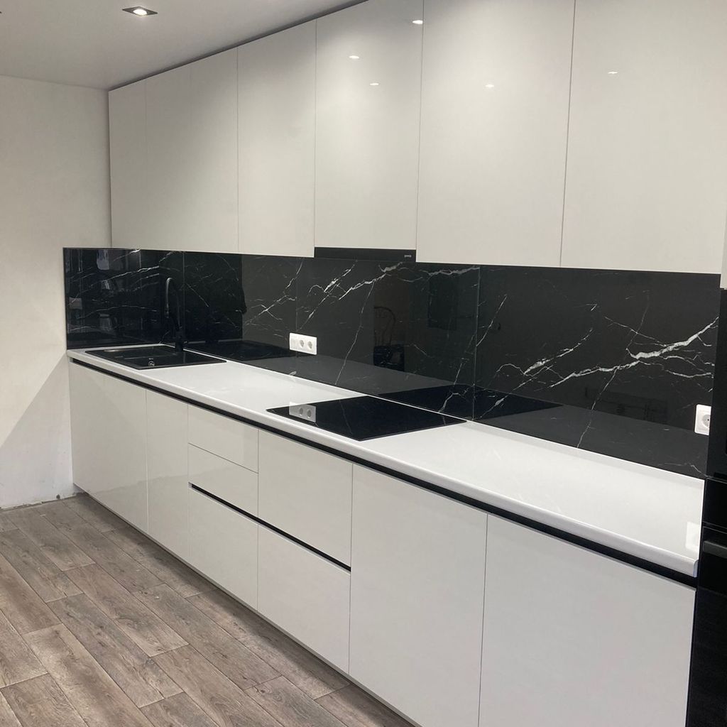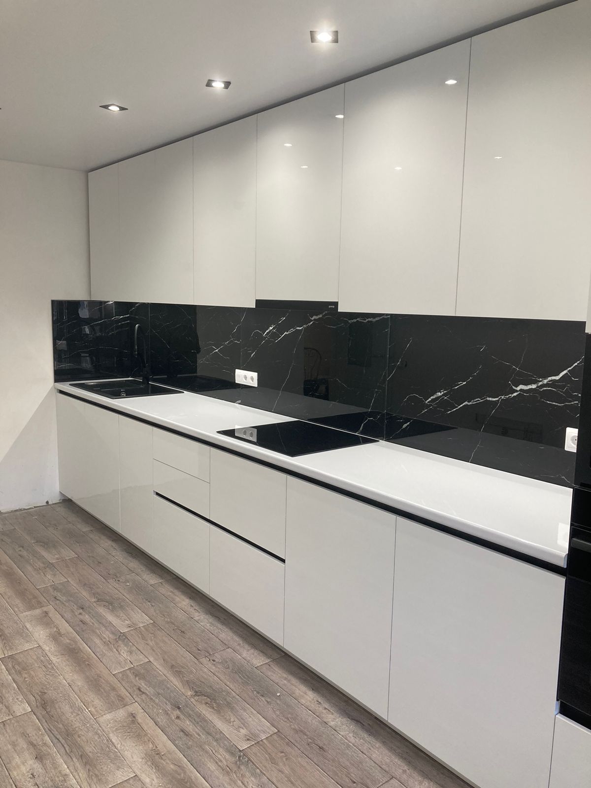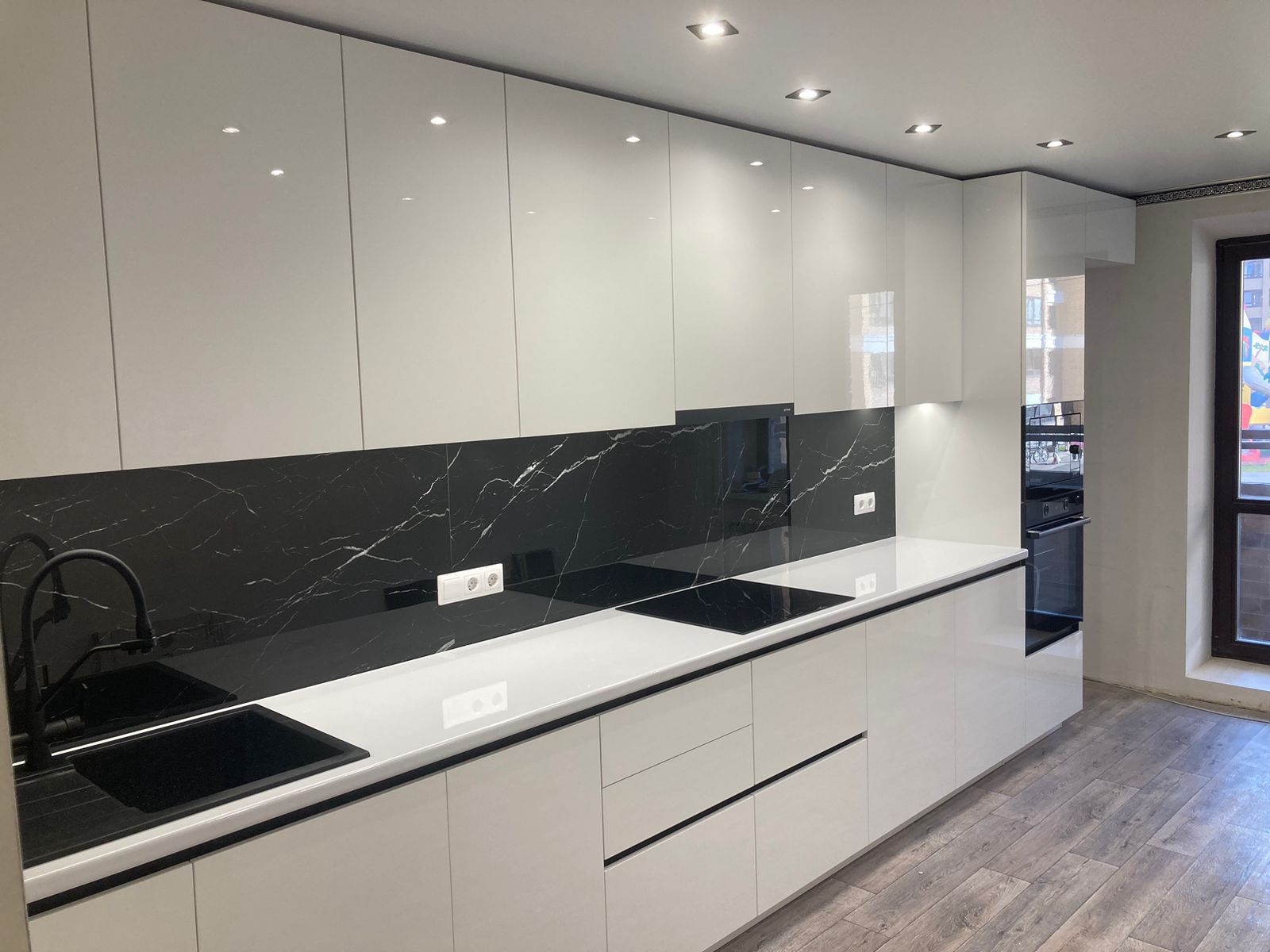 Этот прямой кухонный гарнитур — наглядный пример того, как лаконичная цветовая гамма и продуманная эргономика создают пространство, одновременно элегантное и максимально практичное. Сочетание белых глянцевых фасадов с чёрным мраморным фартуком рождает выразительный контраст, который визуально расширяет пространство, наполняя его светом и строгой гармонией.