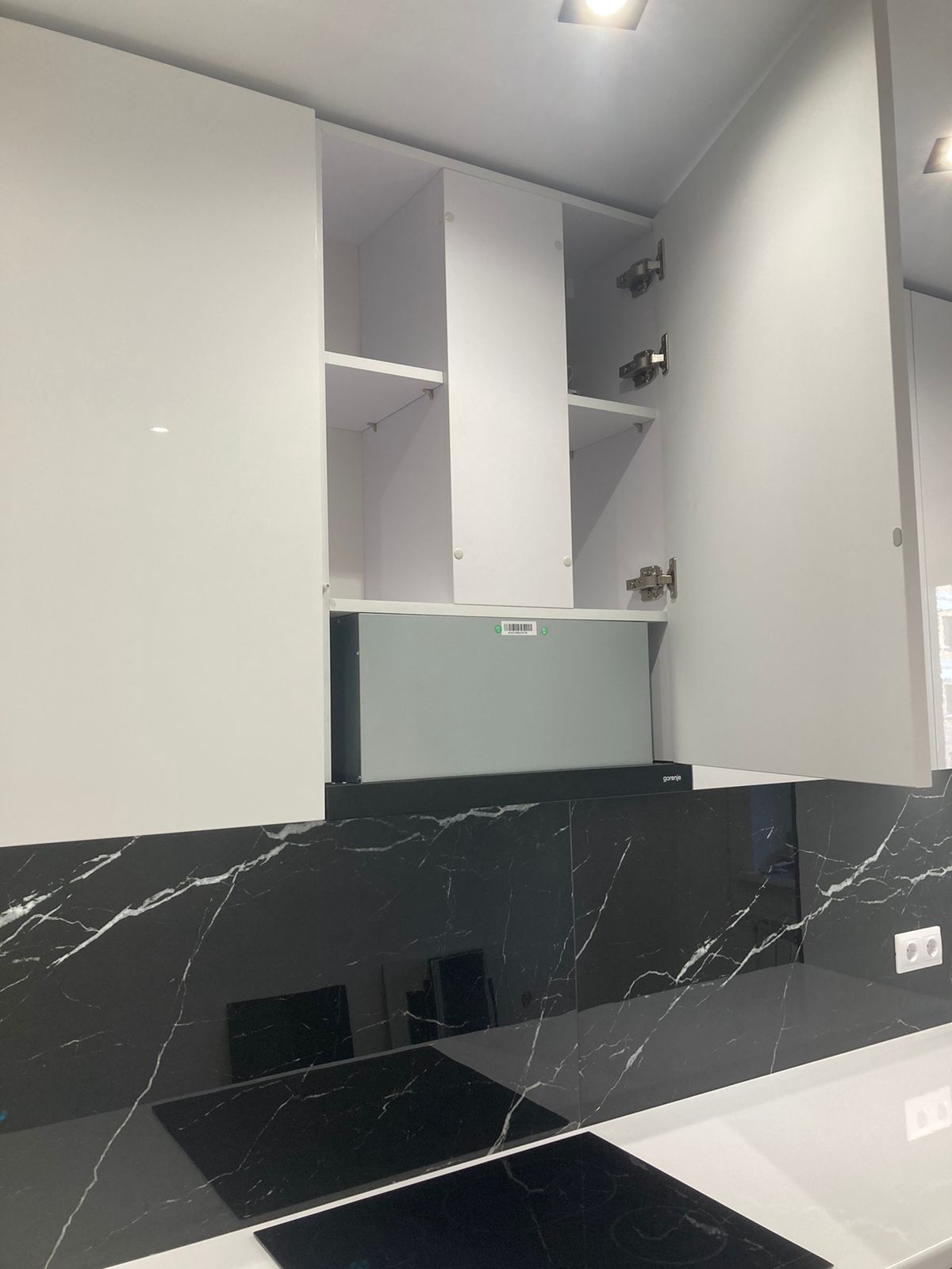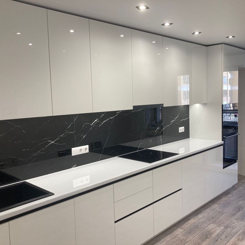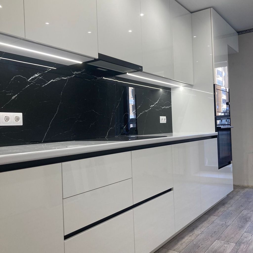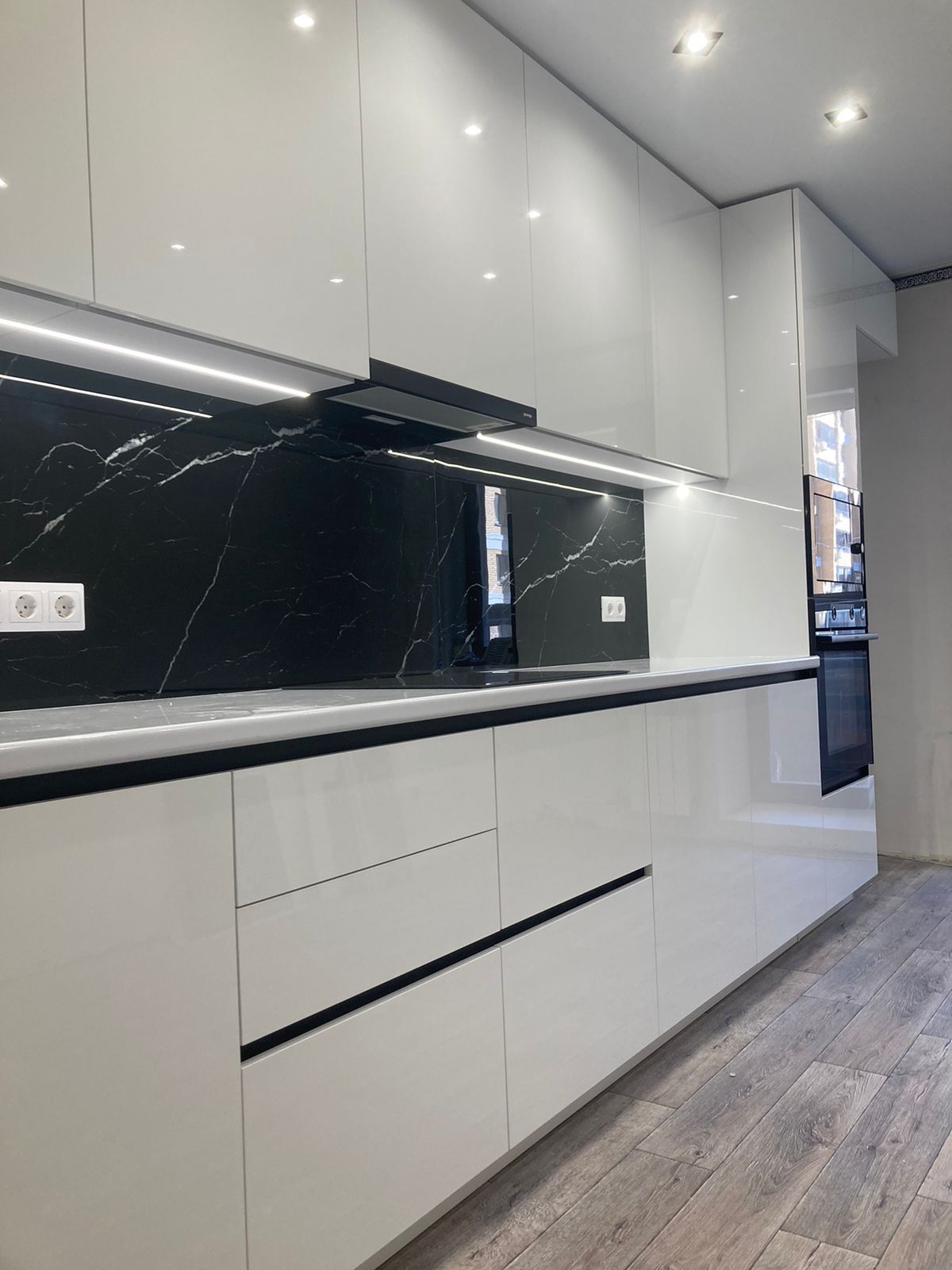 Доминанта проекта — ослепительно белые глянцевые фасады, которые отражают свет и создают ощущение простора даже в компактном помещении. Им противопоставлен глубокий чёрный фартук с выразительной мраморной текстурой, добавляющий интерьеру драматизма и роскоши. Отсутствие ручек и лаконичные формы подчёркивают современный минималистичный подход, где каждая деталь работает на общую эстетику.