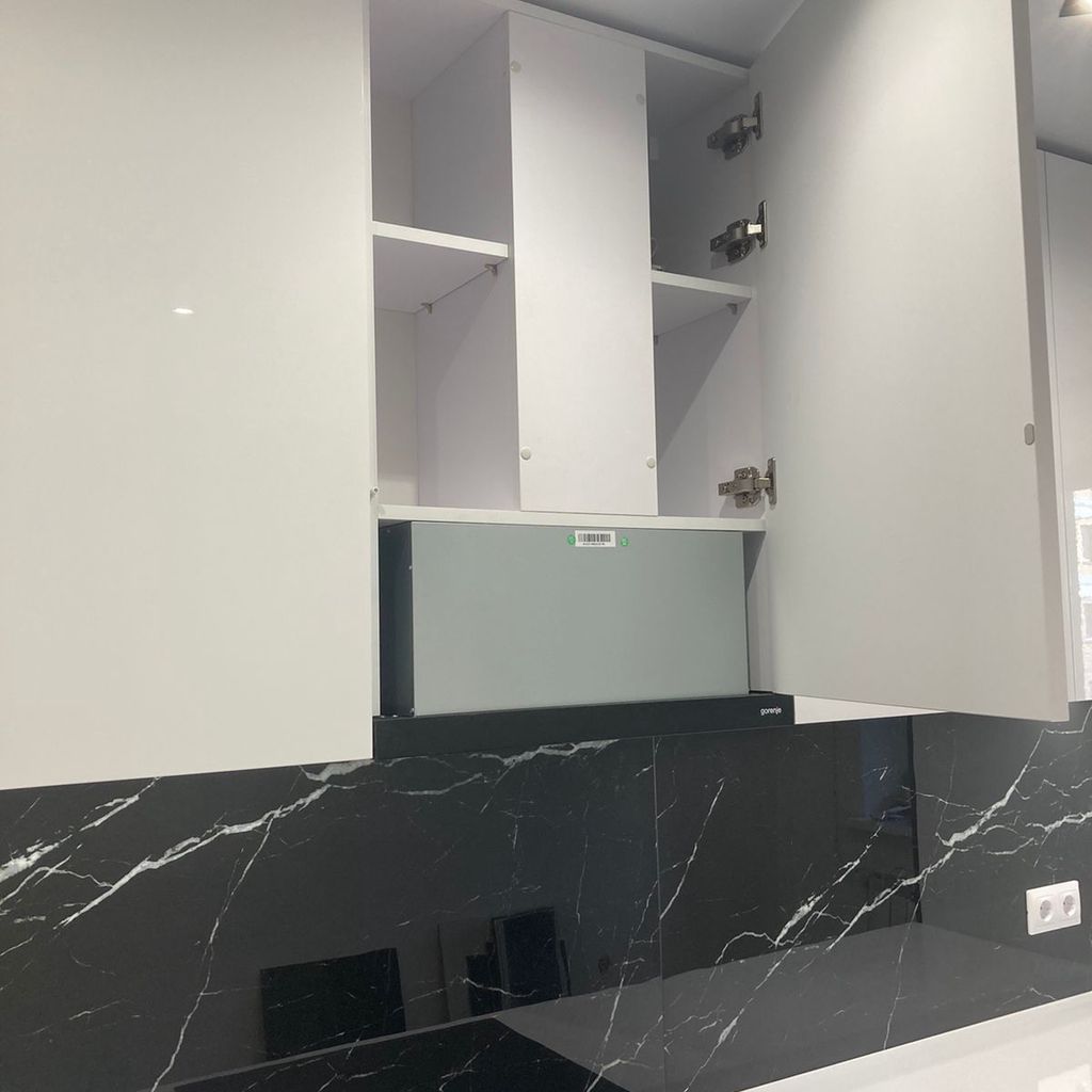 - Фасады: Глянцевые, белые, выполнены по технологии «push-to-open» (открывание нажатием) для абсолютной чистоты линий.
