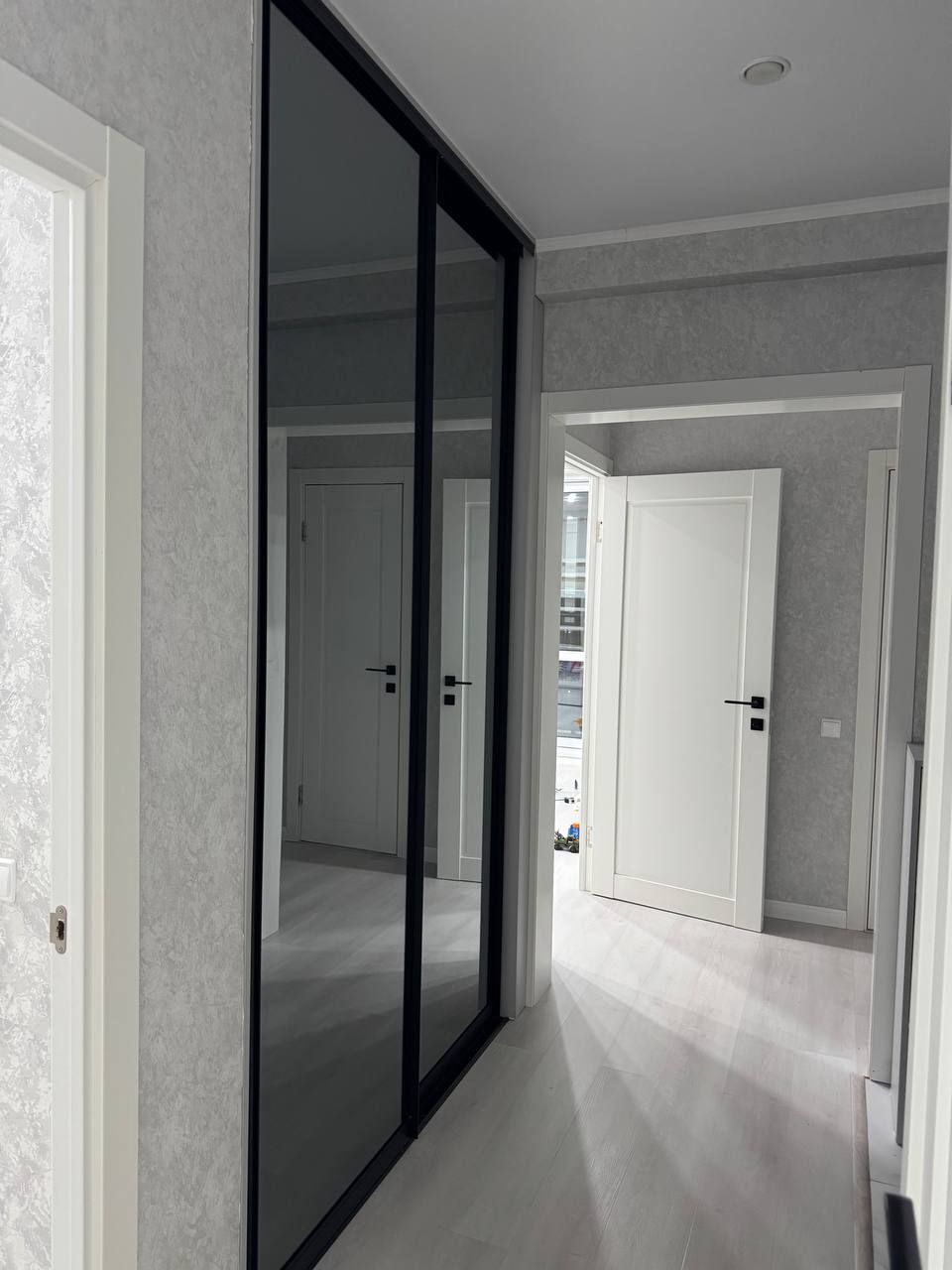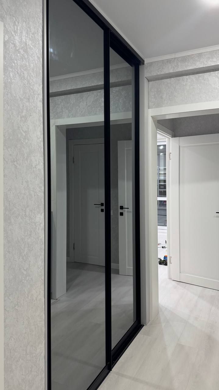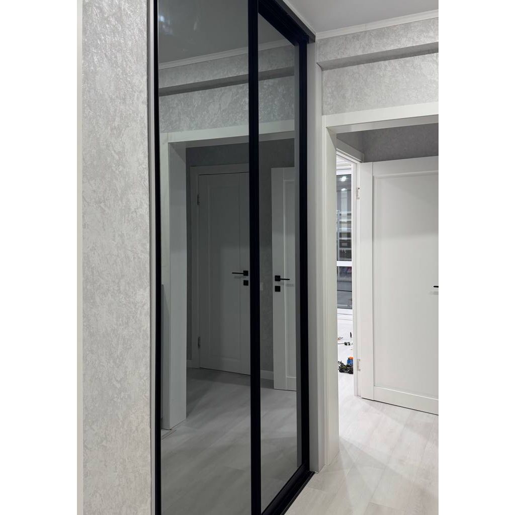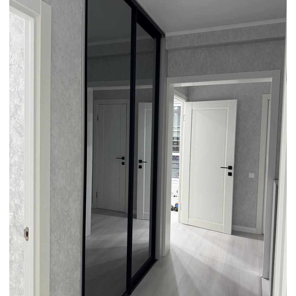 Доминанта проекта — визуальная легкость и практичность. Шкаф-купе во всю стену с тонированным зеркалом "Графит" не только решает вопрос хранения, но и зрительно расширяет пространство. Лаконичная тумба продолжает общую эстетику, создавая гармоничный ансамбль. Черные направляющие и профиль добавляют интерьеру современной строгости и завершенности.